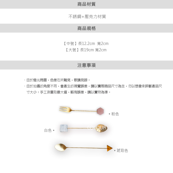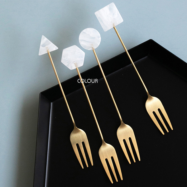 日式幾何不銹鋼咖啡【叉/勺】 啞光金效果 手工拉絲工藝/盡量手洗 幾何造型搭配獨特大理石紋理 簡約優雅 手工打磨手柄 給你絕佳握感 優選食用級304不鏽鋼 耐用耐腐蝕 設計感十足 符合你精緻的品味 小巧典雅的餐具 陪伴你的下午茶時光 商品規格: 【中號】長12.2cm 寬2cm 【大號】長19cm 寬2cm