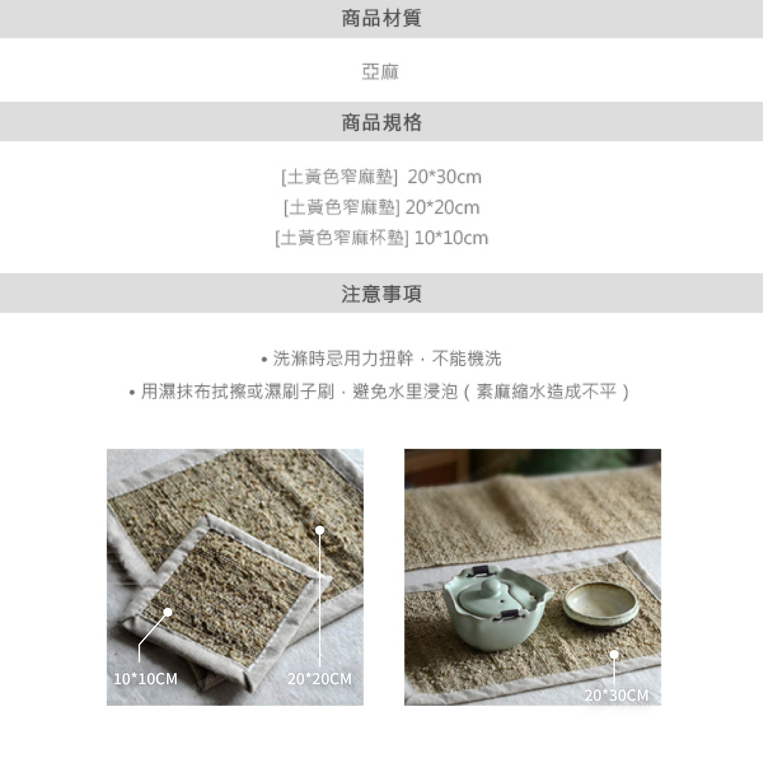 日式禪意亞麻杯墊布【三款尺寸】 「苧麻」自古便是重要的紡織纖維作物,史稱“富貴絲, 苧麻纖維中間有溝狀空腔,管壁多孔隙, 因而透氣性比棉纖維高三倍左右,具有防腐、 防黴等功能,被稱為“天然纖維 ”。 商品規格: 大款 20*30cm 中款 20*20cm 小款 10*10cm