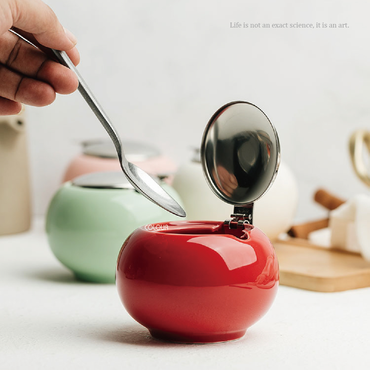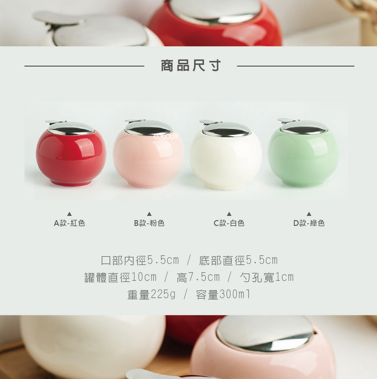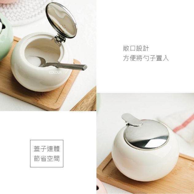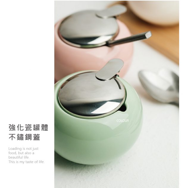 日式簡約帶蓋陶瓷調味罐 烹飪調味罐是每個廚房必備收納 廚房放著造型討喜調味罐 靜靜地陪著你享受料理美好時光☕ 敞口設計 方便將勺子置入 單手輕按蓋子即可打開 強化瓷罐體 不鏽鋼蓋 乾淨、簡約、光亮細膩 方便使用 四種顏色可以區別調味罐 讓你的廚房更加簡潔方便 【商品尺寸】 口部內徑5.5cm / 底部直徑5.5cm 罐體直徑10cm / 高7.5cm / 勺孔寬1cm 重量225g / 容量300ml