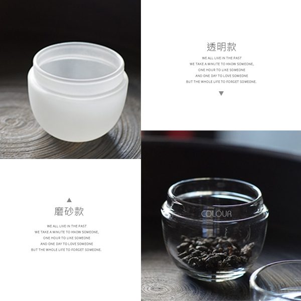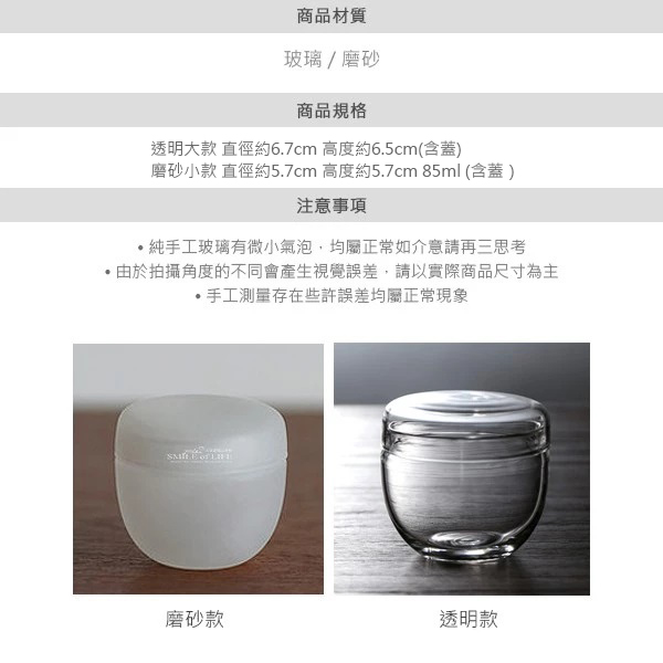 日式茶倉迷你茶葉罐【透明/磨砂款】 採用高硼硅玻璃 透光性好 質感輕盈 設計簡約 耐看耐用 商品尺寸: 透明大款 直徑約6.7cm 高度約6.5cm 140ml (含蓋 ) 磨砂小款 直徑約5.7cm 高度約5.7cm 85ml (含蓋)