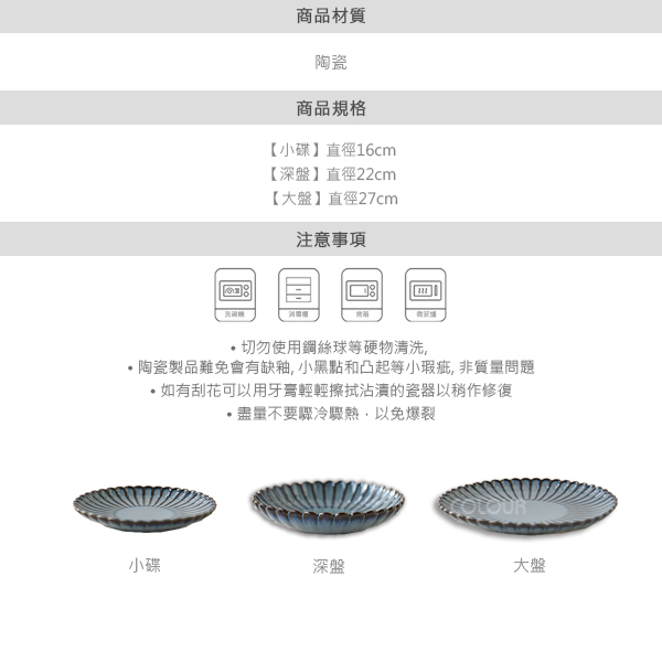 日式陶瓷菊皿西餐盤【三款】 瓷質厚實 溫潤觸感 採用優質瓷泥, 盤深厚實觸感細膩, 色澤光亮踏實用料, 釉面光滑,使用安心。 商品規格: 小碟-16cm 深盤-22cm 大號盤-27cm