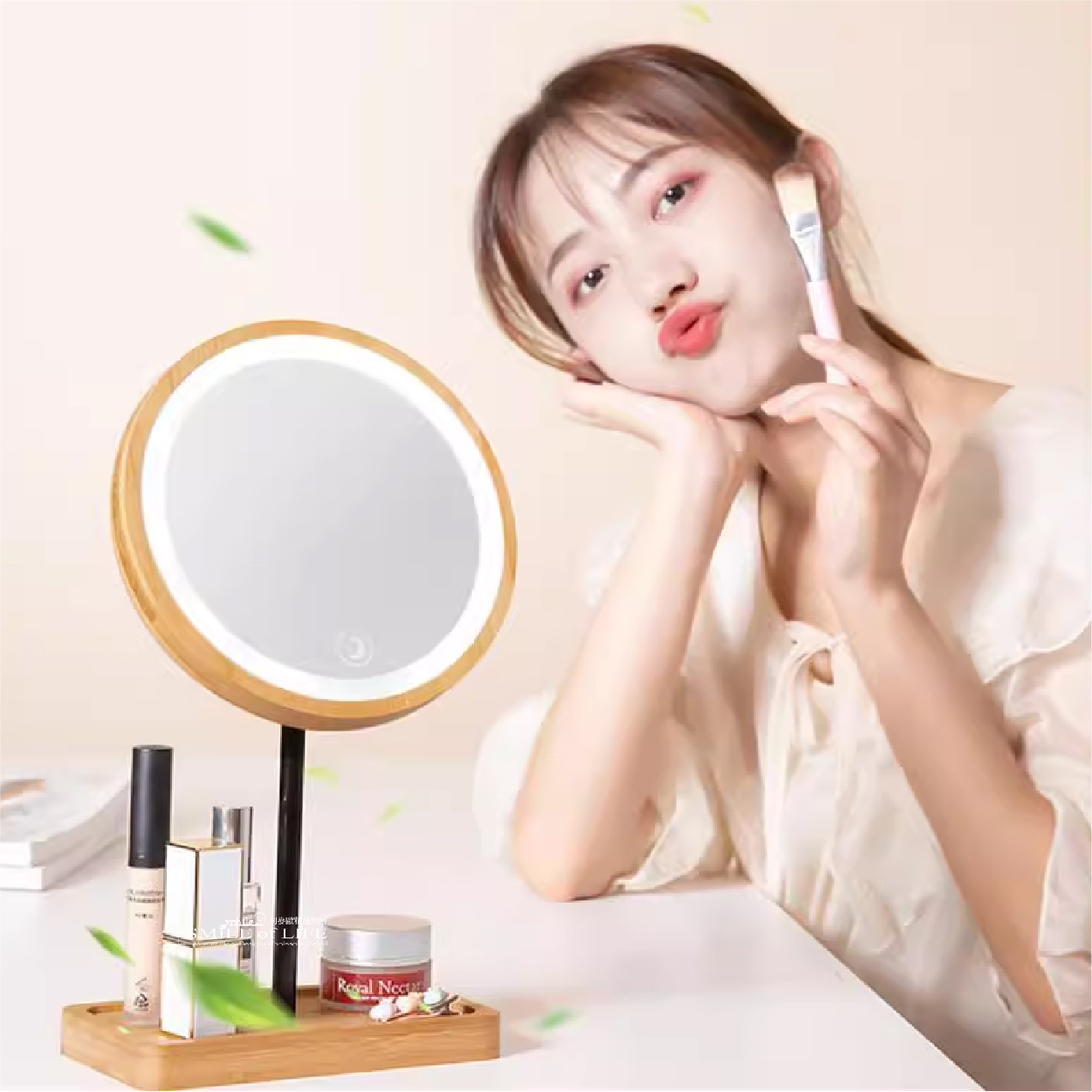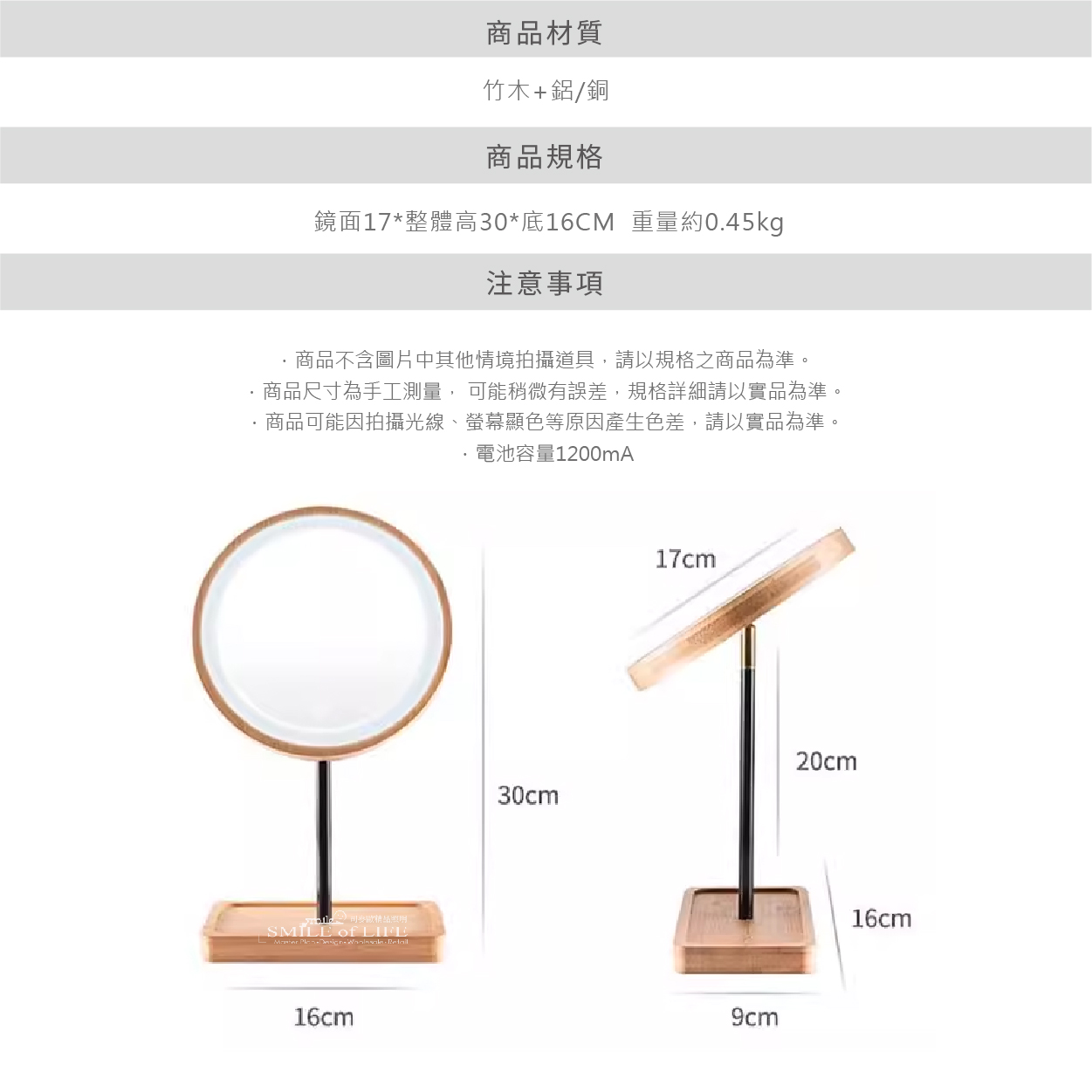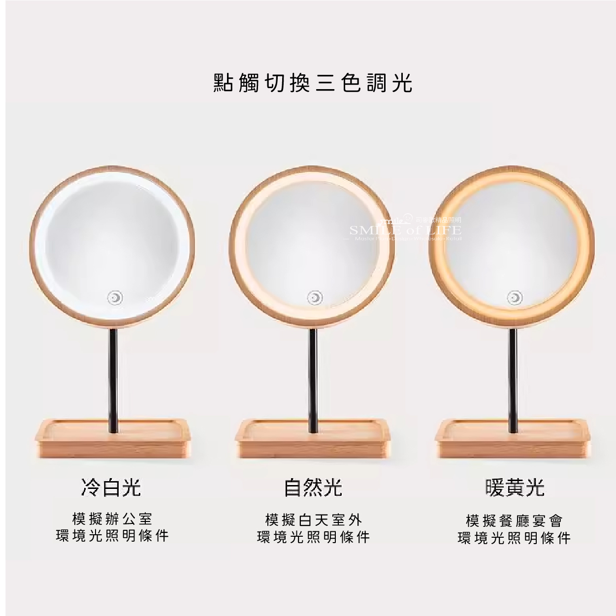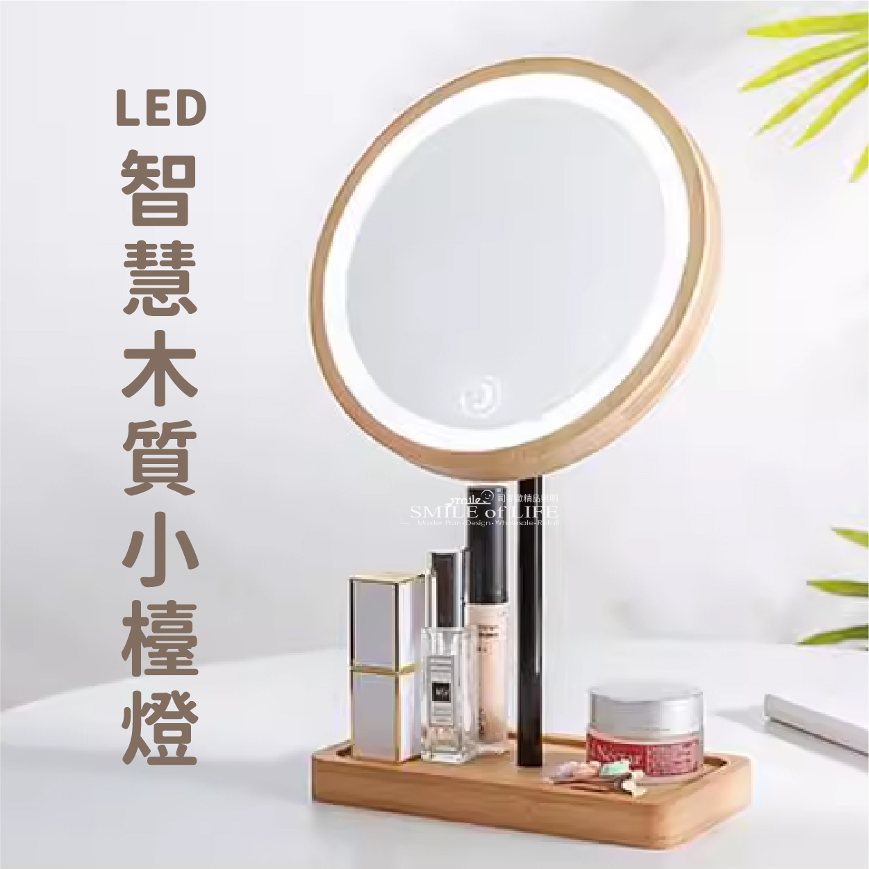 木質LED智慧化妝鏡 我們精心設計的木質底座+LED補光化妝鏡 融合了時尚與實用,不僅擁有可調節的三種色溫 還帶來清晰明亮的照明效果,助您輕鬆打造完美妝容 【特色】 ✨三種色溫隨意切換 ✨多種角度自由調整 ✨鏡面可360度旋轉