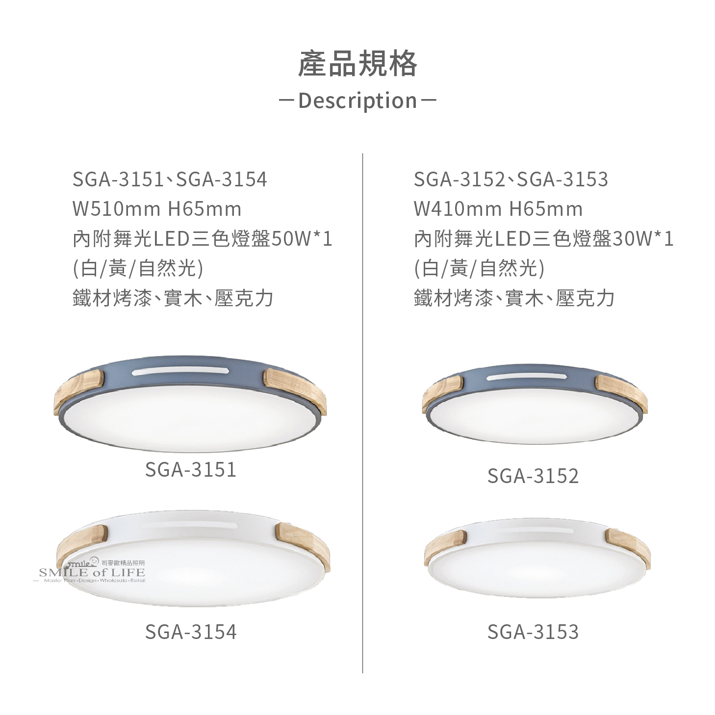 木飾質感吸頂燈 簡約造型,不奪目但耐看 鐵藝搭上原木包邊設計,簡單卻不失質感 - 柔和的燈光,溫暖的氛圍 舒緩了日常的消磨, 為疲憊的一天劃上美好的句點。 商品規格: 名稱:木飾質感吸頂燈50W.灰色 型號 : SGA11-2191(SGA10-3151) 尺寸 : 寬800mm*高365mm 光源 : 內附舞光LED30W三色燈盤(白/黃/自然) 電子IC開關:無 材質 : 鐵材烤灰漆、原木、壓克力 名稱:木飾質感吸頂燈30W.灰色 型號 : SGA10-3152 尺寸 : 寬800mm*高365mm 光源 : 內附舞光LED30W三色燈盤(白/黃/自然) 電子IC開關:無 材質 : 鐵材烤灰漆、原木、壓克力 名稱:木飾質感吸頂燈30W.白色 型號 : SGA10-3153 尺寸 : 寬800mm*高365mm 光源 : 內附舞光LED30W三色燈盤(白/黃/自然) 電子IC開關:無 材質 : 鐵材烤漆、原木、壓克力 名稱:木飾質感吸頂燈50W.白色 型號 : SGA10-3154 尺寸 : 寬800mm*高365mm 光源 : 內附舞光LED30W三色燈盤(白/黃/自然) 電子IC開關:無 材質 : 鐵材烤漆、原木、壓克力