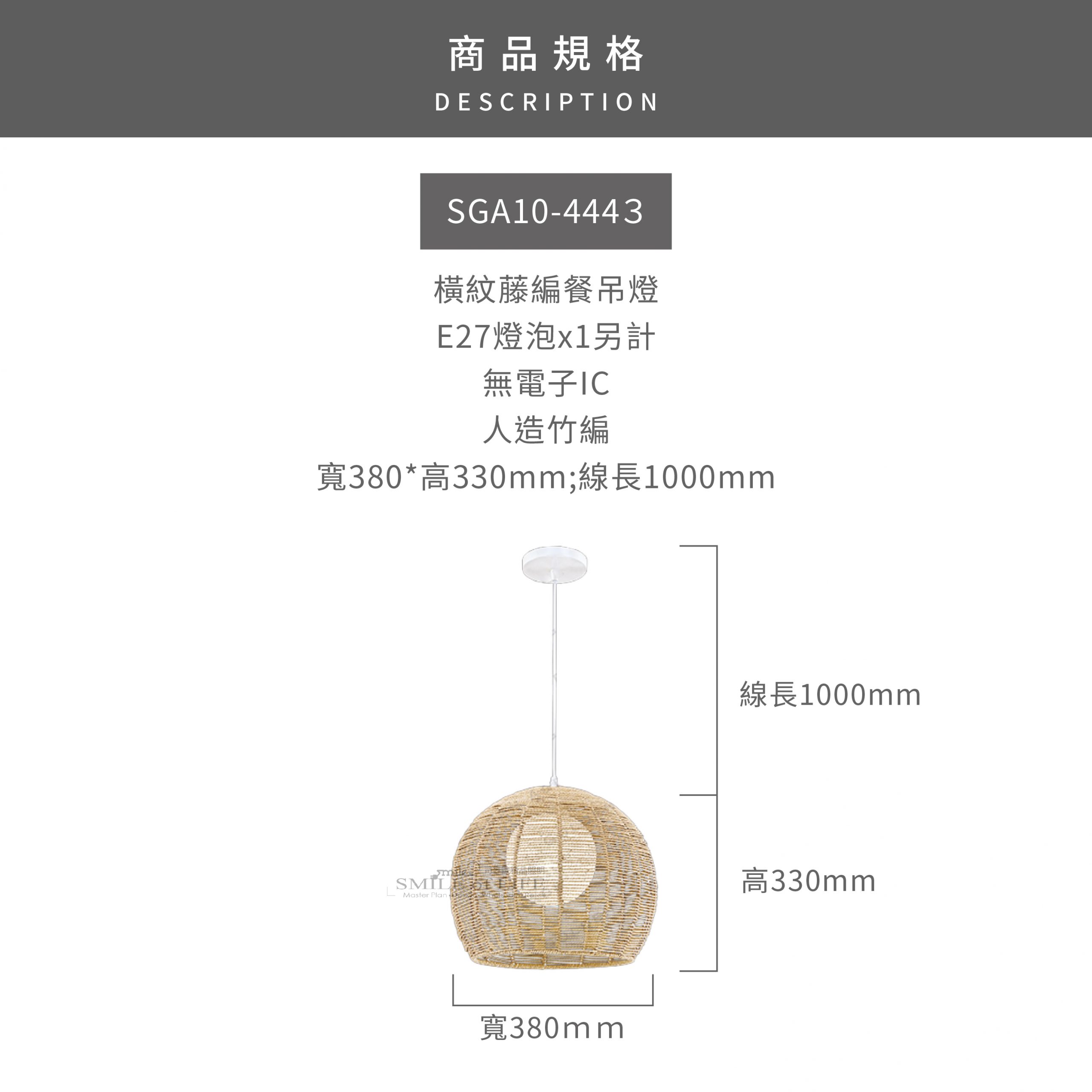 橫紋藤編餐吊燈 SGA10-4443 質感的籐編織設計 如同柔和的陽光穿透樹蔭 織就出寧靜而雅致的用餐空間 讓每一刻都感受到輕盈和愜意 商品規格: / 適用光源:E27燈泡x1另計 材質:人造竹編 尺寸:寬380*高330mm 線長1000mm 📣 此為金色年代燈飾,原廠保固2年 並以投保1000萬的產品責任險,請安心購買 - 💡 台灣實體店家,舞光授權經銷商,原廠保固兩年 💡 商品均有開立發票,附收據可打統編,安心購物有保障