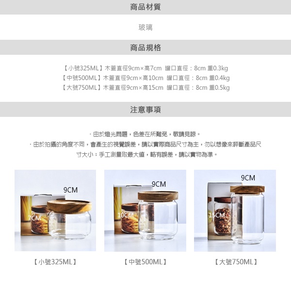 相思木蓋玻璃密封罐 通透玻璃表面光滑 搭配相思木蓋子 密封緊實,防腐效果極好! 凹槽平底設計 儲物罐堆疊放置不滑落 可存放各種零食,乾果、茶葉、咖啡等等 用途廣泛,保持乾燥減少發霉 多方滿足您的需求! 耐熱約150度(微波爐、洗碗機可用,木蓋不適用) / 商品尺寸: 325ml:木蓋直徑9cm×高7cm 罐口直徑:8cm 重0.3kg 適合放香料,茶葉 500ml:木蓋直徑9cm×高10cm 罐口直徑:8cm 重0.4kg 適合咖啡豆,堅果,糖果 750ml:木蓋直徑9cm×高15cm 罐口直徑:8cm重0.5kg 適合放各種雜糧,堅果等