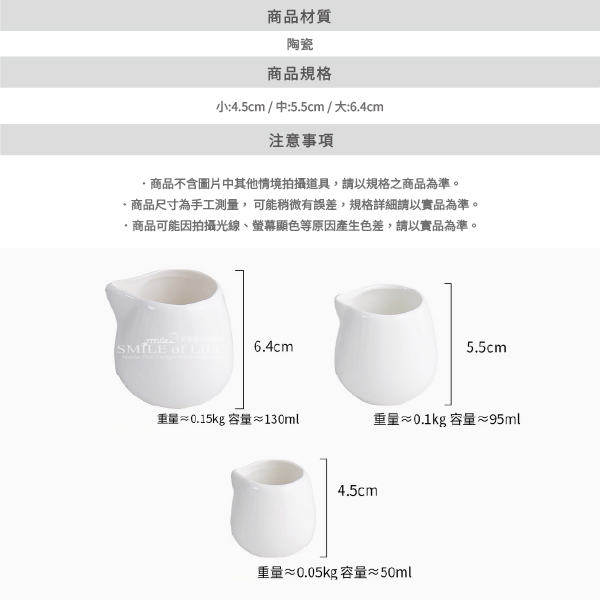 ✨簡約迷你陶瓷奶壺✨ 一手掌握的小巧設計,為日常餐桌增添優雅與便利。 簡約流暢的線條搭配溫潤的陶瓷質感,讓倒奶、淋醬的每一刻都成為生活中的小確幸。 特色亮點: ✅ 極簡設計:圓潤線條,百搭各種餐具風格 ✅ 迷你容量:適合倒牛奶、蜂蜜、醬汁等調味 ✅ 陶瓷質感:光滑細膩,手感溫潤,安全無異味 ✅ 流暢壺嘴:精準控制流量,倒取不滴漏 ✅ 多用途:適用於咖啡館、下午茶、家用餐桌 輕巧實用,為你的餐桌增添一抹簡約美學!☕✨ ⭕洗碗機 ⭕微波爐 ❌烤箱 商品規格: 小號奶壺(無手柄)-高4.5cm 容量約50ML 中號奶壺(無手柄)-高5.5cm 容量約95ML 大號奶壺(無手柄)-高6.4cm 容量約130ML![]()