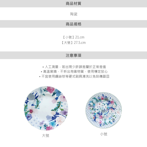 美國進口花卉陶瓷圓盤【兩款】 手刷上色,質樸天然的創作 釉面色彩手刷而成,經窯變呈現出更具藝術創作的美感, 質樸天然表面光澤如水波般閃耀 經典平盤,使用上多樣且美觀, 從甜品、牛排到創意菜, 都有舒展的表現張力, 兩種尺寸,可按需要挑選 進口商品或有瑕疵 小刮痕 黑點之類 在所難免 再好的產品也難讓所有人都滿意,要求完美的顧客 遠觀就好請慎拍哦! 商品規格: 【小號】直徑 21cm 【大號】直徑 27.5cm