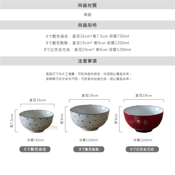 美國釉下彩陶瓷8吋碗 數量不多,局部有描金不可微波爐 非常難得的貨,喜歡的不可錯過 作為麵碗、粥碗、湯碗都很實用 輕微瑕疵不可避免,下單即默認 商品規格: 8寸紅色金花紙:直徑19* 高度9cm 容量1200ml 8寸藍色點點:直徑19* 高度9cm 容量1200ml 數量:一只入