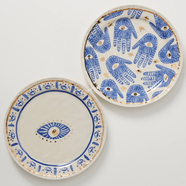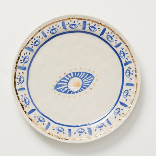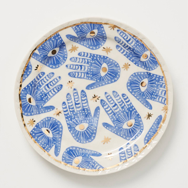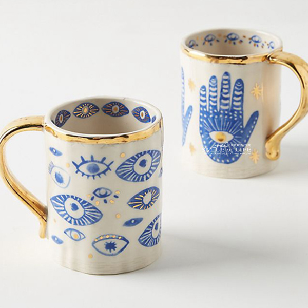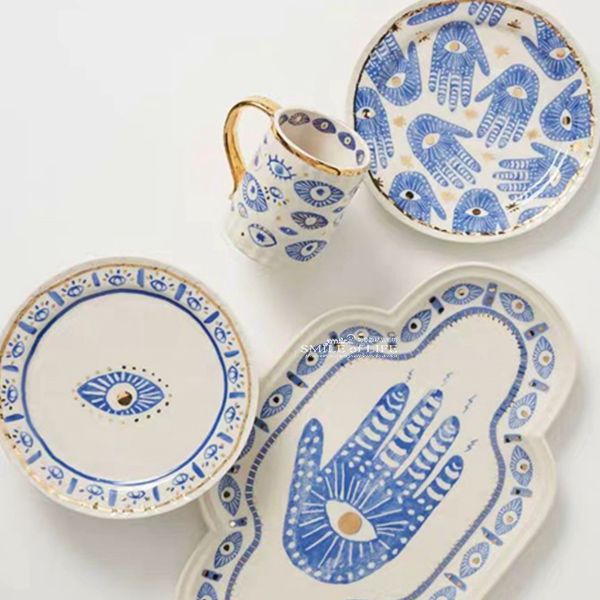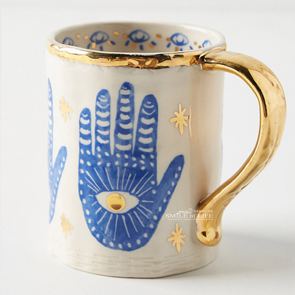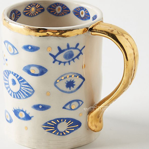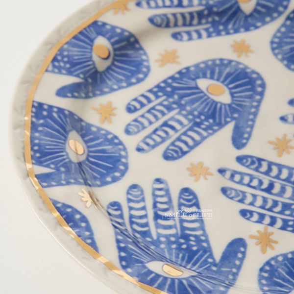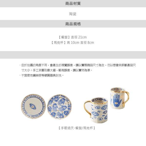 美國金邊手繪陶瓷餐具【餐盤/馬克杯】 手彩 描金 不規則感 且寓意特別好手眼通天~ 非常適合下午茶甜點 進口商品難免有小瑕疵 介意者請勿下單 商品規格: 手印/眼睛餐盤 直徑21公分 手印/眼睛馬克杯 尺寸10*8cm 容量400ml ***不可進微波爐 洗碗機***