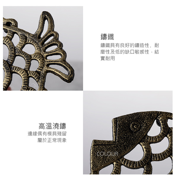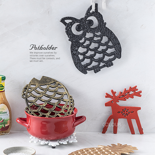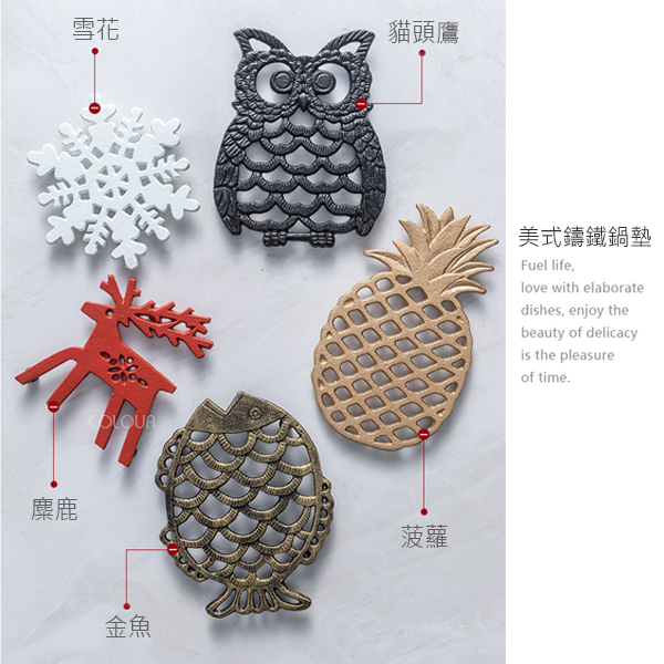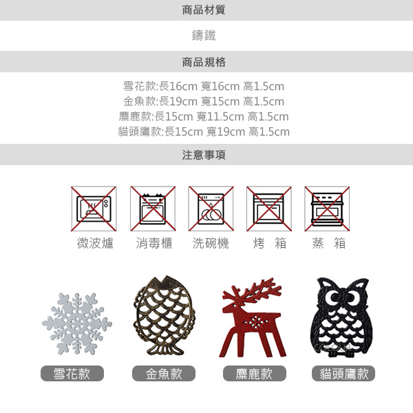 美式鑄鐵隔熱鍋墊 #鑄鐵鍋墊 #美式的粗曠與可愛 讓人為之一亮的鍋架 有美式鄉村的粗曠與可愛 沉甸甸的鑄鐵,增添厚重的感覺 底部有厚實的橡膠墊腳 可以保護桌面+防滑的效果 不過更多的人還是喜歡買回去做裝飾品用 畢竟,他們實在太好看了嘛!! 【商品尺寸】 雪花款: 長16cm 寬16cm 厚度1.5cm 金魚款: 長19cm 寬15cm 厚度1.5cm 麋鹿款: 長15cm 寬11.5cm 厚度1.5cm 貓頭鷹款:長15cm 寬19cm 厚度1.5cm