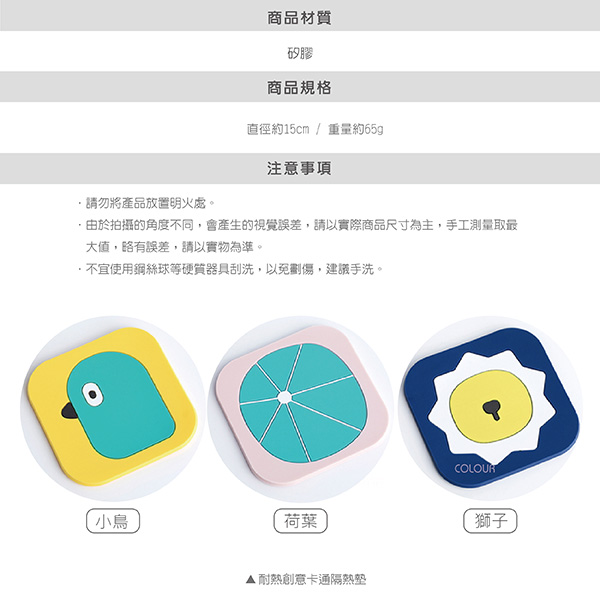 耐熱創意卡通矽膠隔熱墊 (荷葉 / 獅子 / 小鳥) 可愛萌趣 讓有童心的你有好心情 花式小動物圖案 配色亮麗 放在桌上也是一道風景 柔韌不變形 用幾年完全沒問題 超舒適手感 耐用抗摔 不怕油汙易清洗 隔熱防燙 砂鍋也能直接上桌 厚實矽膠材質 耐高溫200度 防燙同時 呵護桌面 商品尺寸 直徑約15cm / 重量約65g