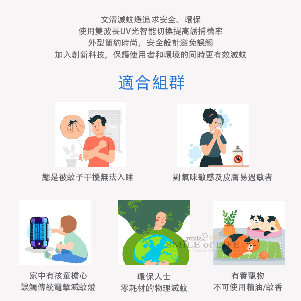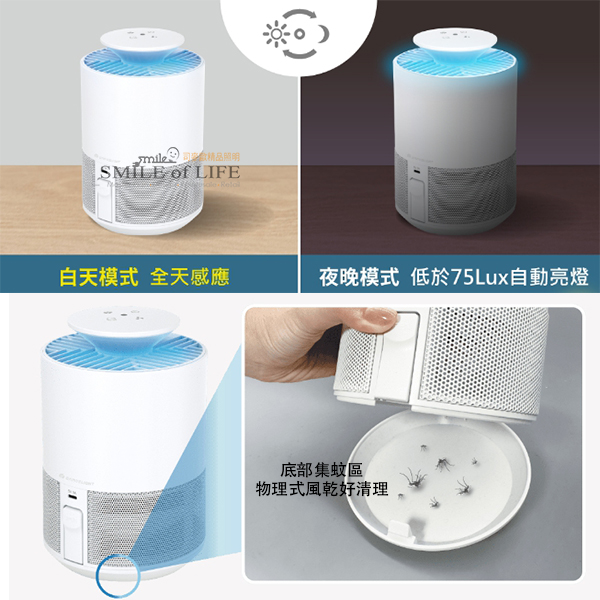 舞光文清滅蚊燈 雙波長UV光智能切換提高誘捕機率 漩渦氣流吸入式捕捉,物理式風乾滅蚊 無電擊、零噪音,不怕家中寶貝伸手誤觸 智慧光感應偵測環境光線,低光照時自動開啟捕蚊 ✦ UV紫光誘蚊 ✦ 二段風量調節 ✦ 日夜模式光感應 ✦ 運轉低噪音 商品規格: 産品型號: D-MKHP5 電壓: DC 5V>1A 消耗電力: 5W 波長: 365nm&395nm 材質: ABS、PC 尺寸: 直徑131*高208 mm 內附: USB Type C 2米充電線(需自備充電器) 不可連接快充設備❗
