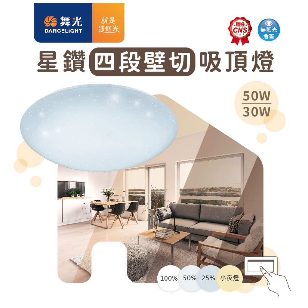 舞光星鑽四段壁切吸頂燈 1. 四段壁切調光 2. 可配合環境使用 3. 切換順序 100%-50%-25%-小夜燈 4. 快速安裝 商品規格: 【30W】 產品型號:LED-CES3ODSW,ED-CES3OWSW 電壓:100-240V 消耗電力:30W 色溫:6500K,3000k 光通量:3100 Im / 1600 Im / 800 Im /15 Im,2900 Im / 1600 Im / 800 Im /15 Im 演色性:80 發光角度:160° 平均壽命:15000hrs 材質:PMMA 星鑽燈罩、鐵材烤白漆、PC防觸電罩 產品尺寸:Ø 390mm²;H120mm 適用坪數:2-3坪 - 【50W】 產品型號:LED-CES5ODSW,ED-CES5OWSW 電壓:100-240V 消耗電力:50W 色溫:6500K,3000k 光通量:5000 Im / 2600 Im / 1400 Im /3Im,4500 Im / 2600 Im / 1400 Im /3Im 演色性:80 發光角度:160° 平均壽命:15000hrs 材質:PMMA 星鑽燈罩、鐵材烤白漆、PC防觸電罩 產品尺寸:Ø 510mm²;H145mm 適用坪數:4-6坪 💡 高雄體店家,舞光授權經銷商,原廠保固兩年 💡 商品均有開立發票,附收據可打統編,安心購物有保障