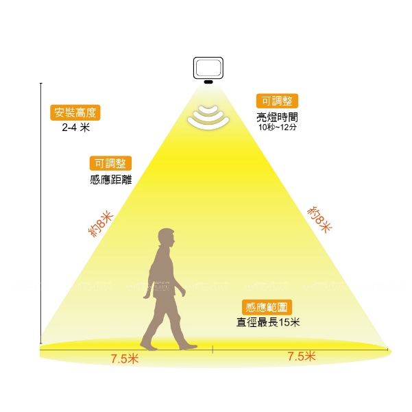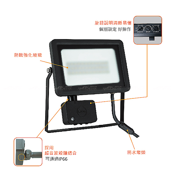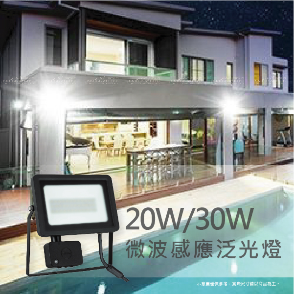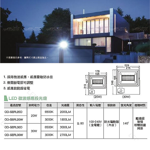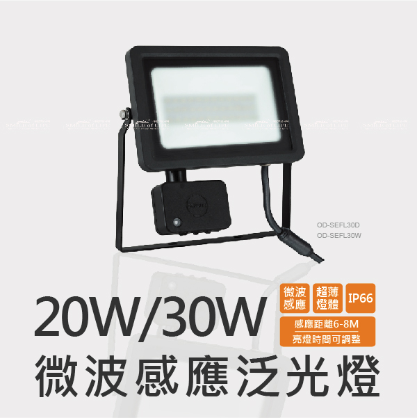 舞光智慧防水微波感應泛光燈 20W/30W【色溫6500K/3000K】 搭配防水堵頭大大提升防水力 防眩強化玻璃,不刺眼 感應孔擴大,光感效果更佳 中文旋鈕說明,清晰易懂,不斷電即可調整 高亮度 100 lm/W 商品規格: 產品型號: 【OD-SEFL20D / OD-SEFL20W】 【OD-SEFL30D / OD-SEFL30W】 適用電壓:100-240V(全電壓) 材質說明:壓鑄鋁、強化玻璃、粉體防鏽烤漆