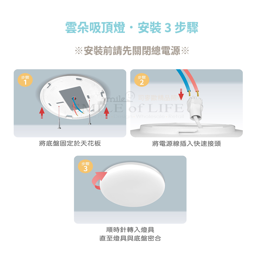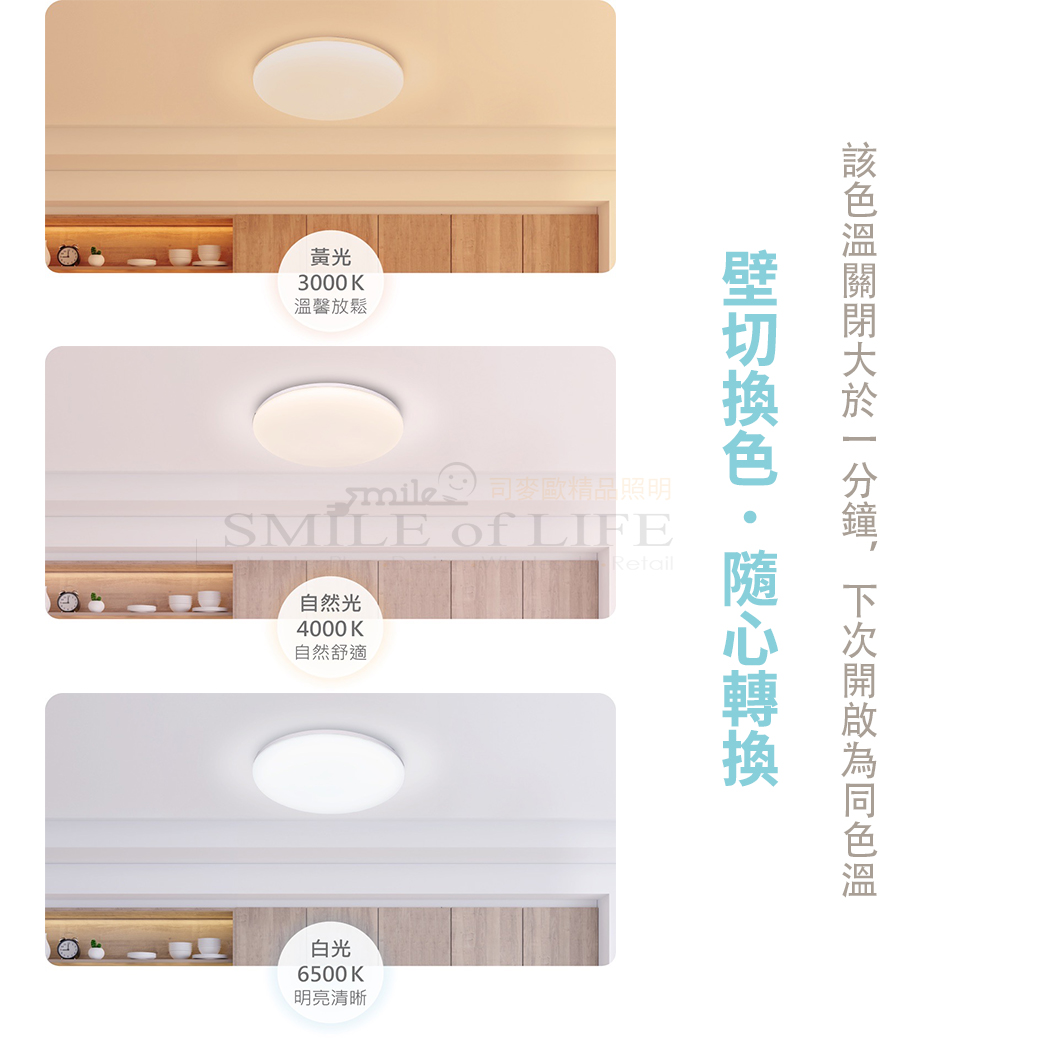 舞光雲朵壁切調光吸頂燈 ✦ 一指切換三色溫 ✦ 側邊發光零死角 ✦ 快速安裝好上手 ✦ 5.9公分輕薄燈體 ✦ 高光效 100 lm/W ※ 單一迴路限裝一組吸頂燈,避免跳段不同步 ※ 商品規格: 產品規格_50W 輸入電壓:100V - 240V全電壓 色 溫:3000K黃光 / 4000k自然光 / 6500K白光 光 通 量:白光4500lm/自然光5000lm黃光5080lm 演 色 性:≧ 80 發光角度:180° 燈體材質:PP塑料 保固:2年 適用坪數:4-6坪 產品尺寸:Ø 450mm²;H 59mm![]()
