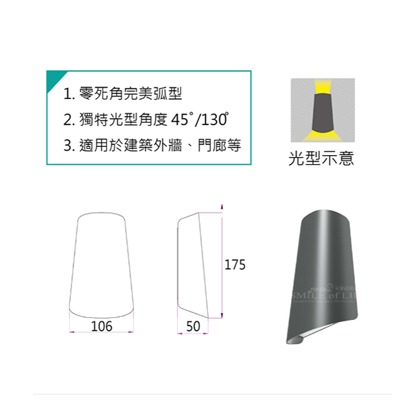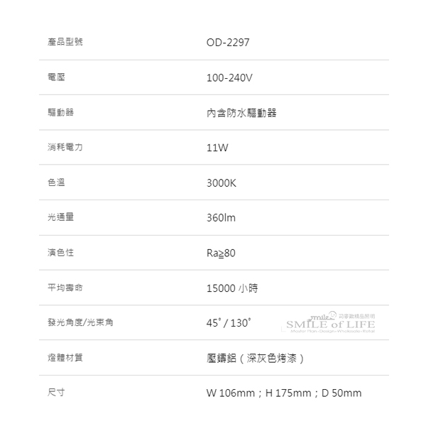 舞光 溫莎壁燈 OD-2297 1. 零死角完美弧形 2. 獨特光型角度45°/130° 3. 適用於建築外牆、門廊等 商品規格: 型號 OD-2297 消耗電力 11W 輸入電壓 100V-240V(全電壓) 驅動器 防水驅動器(內含) 色溫 3000K 光通量 360LM 演色性 ≧80 發光角度 45°/130° 燈體材質 壓鑄鋁 玻璃 粉體防鏽烤漆