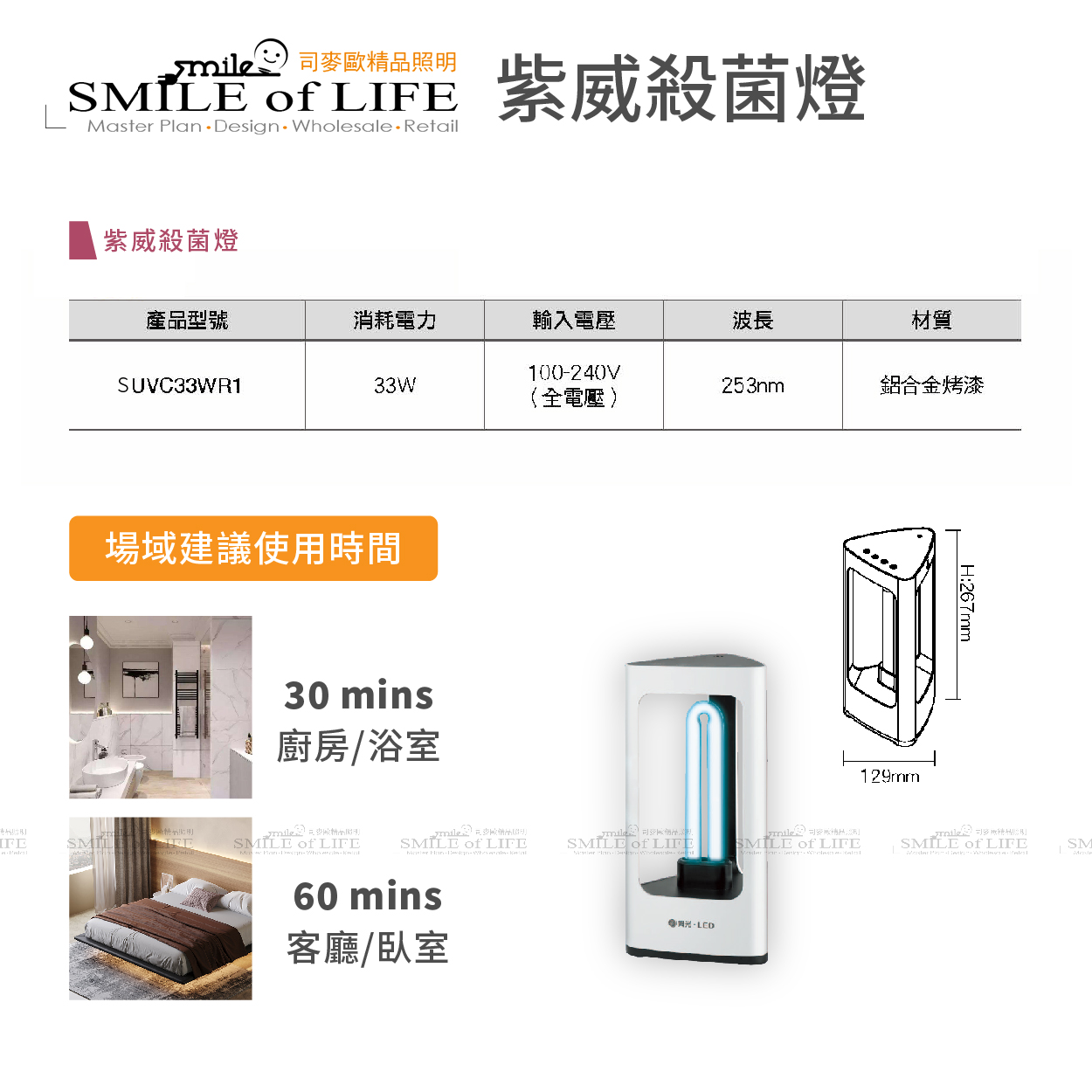 舞光 紫威殺菌燈 SUVC33WR1 通過國際TAF及台灣衛福部認可實驗 最高可有效消滅99.97%有害病菌 1.30秒蜂鳴延時啟動,提醒人員安全撤離 2.微波感應距離5米,生物接近感應自動關閉 ※非主要照明,避免眼睛直視 ※消滅病毒種類以測試報告為準 商品規格 產品型號:SUVC33WR1 尺寸:129mmx267mm 消耗電力:33W 輸入電壓:100V~240V(全電壓) 波長:253nm 材質:鋁合金烤漆 ■ 本商品除非有損壞不得退換貨 ■ ■ 安裝過後恕不退換/偏遠地區郵資另計 ■
