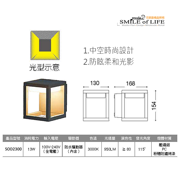 舞光 13W 安妮壁燈SOD2300 1.簡約優雅、簍空設計 2.增添光穎美感 3.適用於建築外牆、庭園等 4.中空時尚設計 5.防眩柔和光影 商品規格: 型號:SOD2300 消耗電力:13W 色溫:3000K 光通量:950LM 演色性:80RA 發光角度/光束角:115° 燈體材質:壓鑄鋁、PC、粉體防鏽烤漆 尺寸:長130*寬168*高154mm 【賣場相關】 💡 台灣實體店家,舞光授權經銷商,原廠保固兩年 💡 商品均有開立發票,附收據可打統編,安心購物有保障 💡 宅配部分偏遠地區或外島需要額外酌收聯運費!!