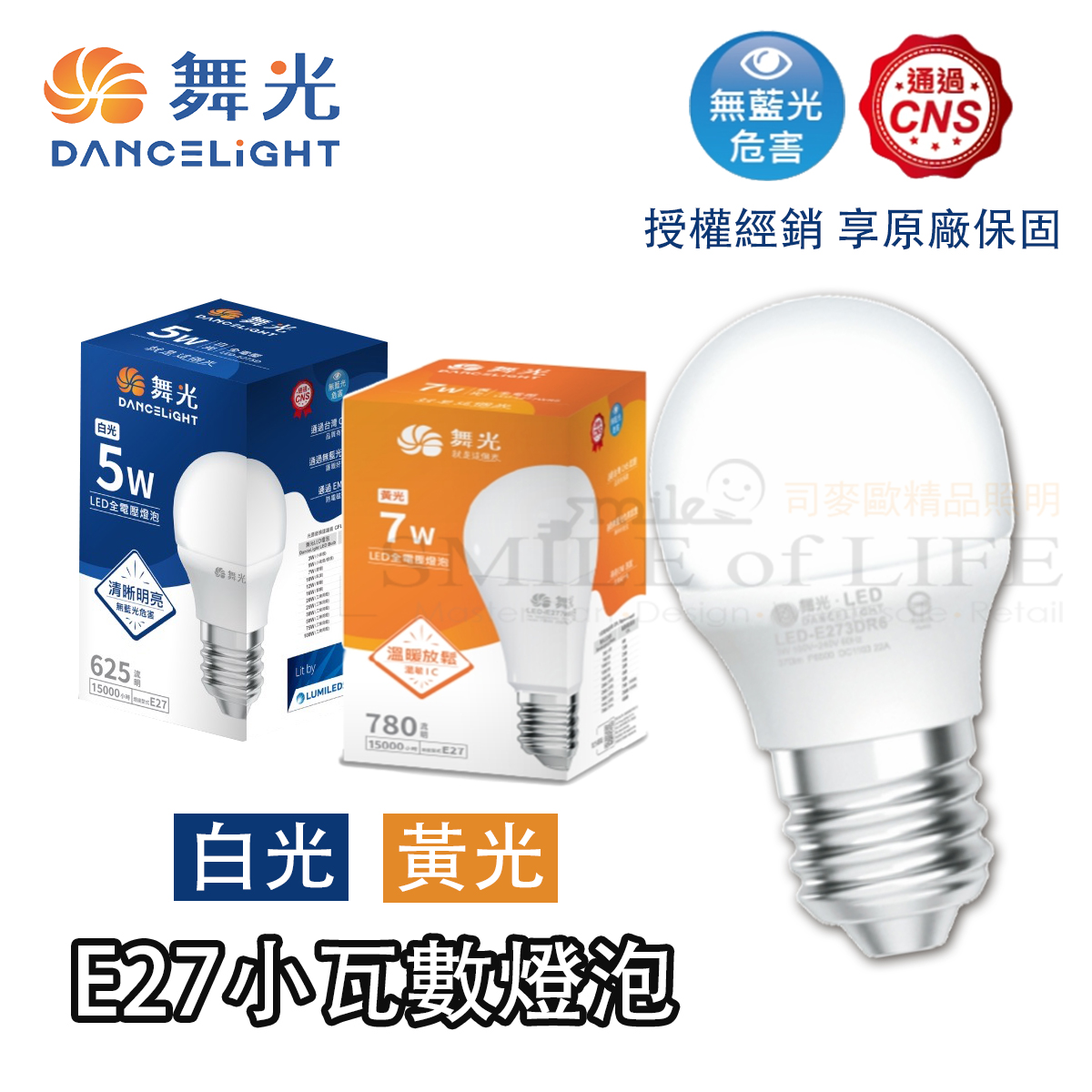 舞光LED小瓦數全電壓燈泡 1. 通過台灣 CNS 認證,品質有保障 2. 通過無藍光危害認證,護眼好安全 3. 通過 EMI 測試,防電磁干擾 4. 超高光通量,照度大於 20W 螺旋,省電約 50% 5. 大廣角 300 ° 發光角度,可產生最大光強照度 6. 長壽命 15000 小時,一顆 LED 燈泡可抵 3 顆以上省電燈泡 7. 高演色性Ra ≧ 80,讓被照物色彩更真實 / 商品規格: 【3W】 電壓:100 ~ 240V 色溫 : 黃光 3000K / 白光 6500K 流明 : 黃光 360lm / 白光 370lm 演色性 : Ra ≧ 80 平均壽命:15000 小時 燈體材質:塑包鋁、PC 罩 燈頭:E27 角度 : 340度 尺寸 : Ø 45 mm x H81mm - 【5W】 電壓:100 ~ 240V 色溫 : 黃光 3000K / 白光 6500K 流明 : 黃光 575lm / 白光 625lm 演色性 : Ra ≧ 80 平均壽命:15000 小時 燈體材質:塑包鋁、PC 罩 燈頭:E27 角度 : 340度 尺寸 : Ø 45 mm x H81mm - 【7W】 電壓:100 ~ 240V 色溫 : 黃光 3000K / 白光 6500K 流明 : 黃光 630lm / 白光 680lm 演色性 : Ra ≧ 80 平均壽命:15000 小時 燈體材質:塑包鋁、PC 罩 燈頭:E27 角度 : 340度 尺寸 : Ø 60 mm x H115mm 💡 台灣實體店家,舞光授權經銷商,原廠保固兩年 💡 商品均有開立發票,附收據可打統編,安心購物有保障