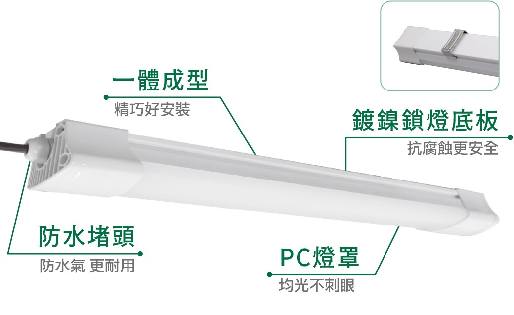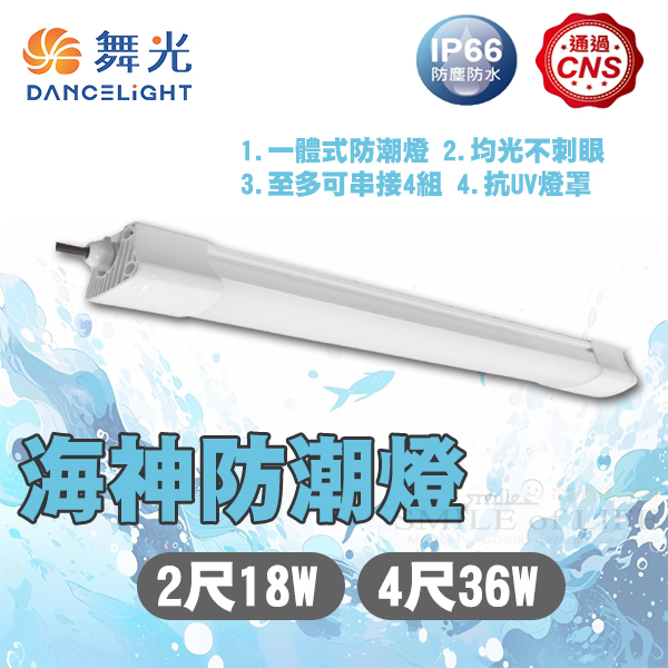 舞光LED海神防潮燈 1.一體式防潮燈 2.均光不刺眼 3.至多可串接四組 產品說明 SODWA36D(白光) 輸入電壓:100V-240V(全電壓) 消耗電力:18W 36W 色溫:6500K 光通量:3600LM 演色性:≧80 發光角度:120° 安裝方式:吸頂式 燈體材質:PC 防護等級:IP66
