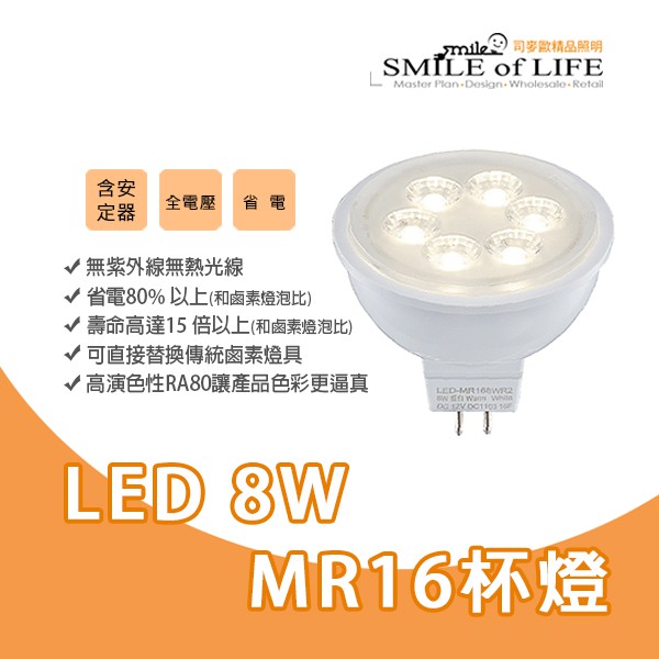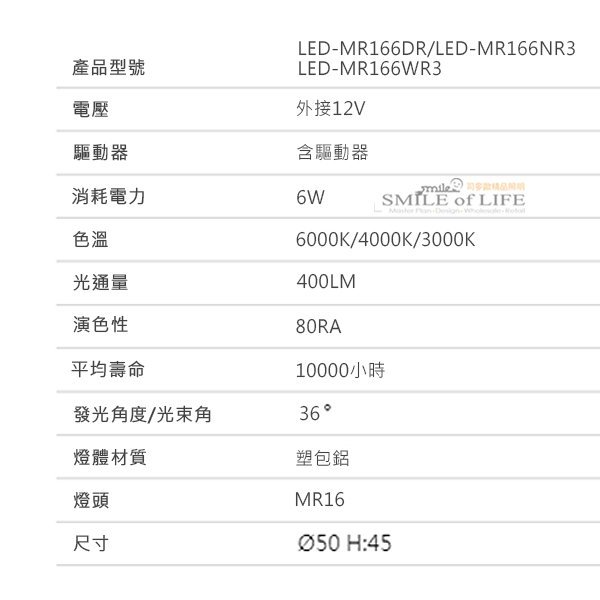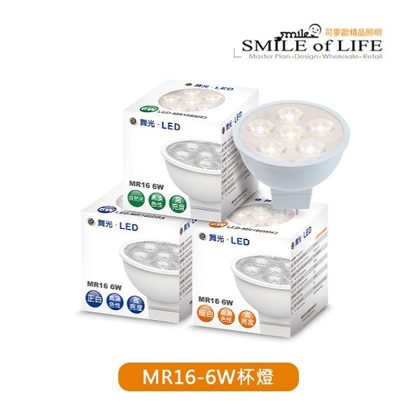 舞光MR16投射燈 1. 高演色性,還原真實色彩 2. 無紫外線,無熱光線 3. 可直接替換傳統鹵素燈具 4. 省電80%以上(和鹵素燈泡比) 5. 壽命高達15倍以上(和鹵素燈泡比) 商品規格: 產品名稱:MR16投射燈泡-6W(杯燈) 產品型號:LED-MR166DR5 / LED-MR166NR5 / LED-MR166WR5 電壓:DC 12V 驅動器:外接型 (需另購驅動器) 消耗電力:6W 色溫:白光6000K / 自然光4000K / 黃光3000K 光通量:400lm/400lm/360lm 演色性:≧ 90;R9 > 0 平均壽命:15000小時 發光角度/光束角:36° 燈體材質:塑包鋁 尺寸:Ø50 H:45mm / 產品名稱:MR16投射燈泡-8W(杯燈) 產品型號:LED-MR168NR2 / LED-MR168WR2 電壓:DC 12V 驅動器:需外接 (需另購驅動器) 消耗電力:8W 色溫:自然光4000K / 黃光3000K 光通量:600lm / 550lm 演色性:≧ 80;R9 > 0 平均壽命:15000小時 發光角度/光束角:36° 燈體材質:塑包鋁 尺寸:Ø50 H:48mm 💡 高雄實體店家,舞光授權經銷商,享原廠保固