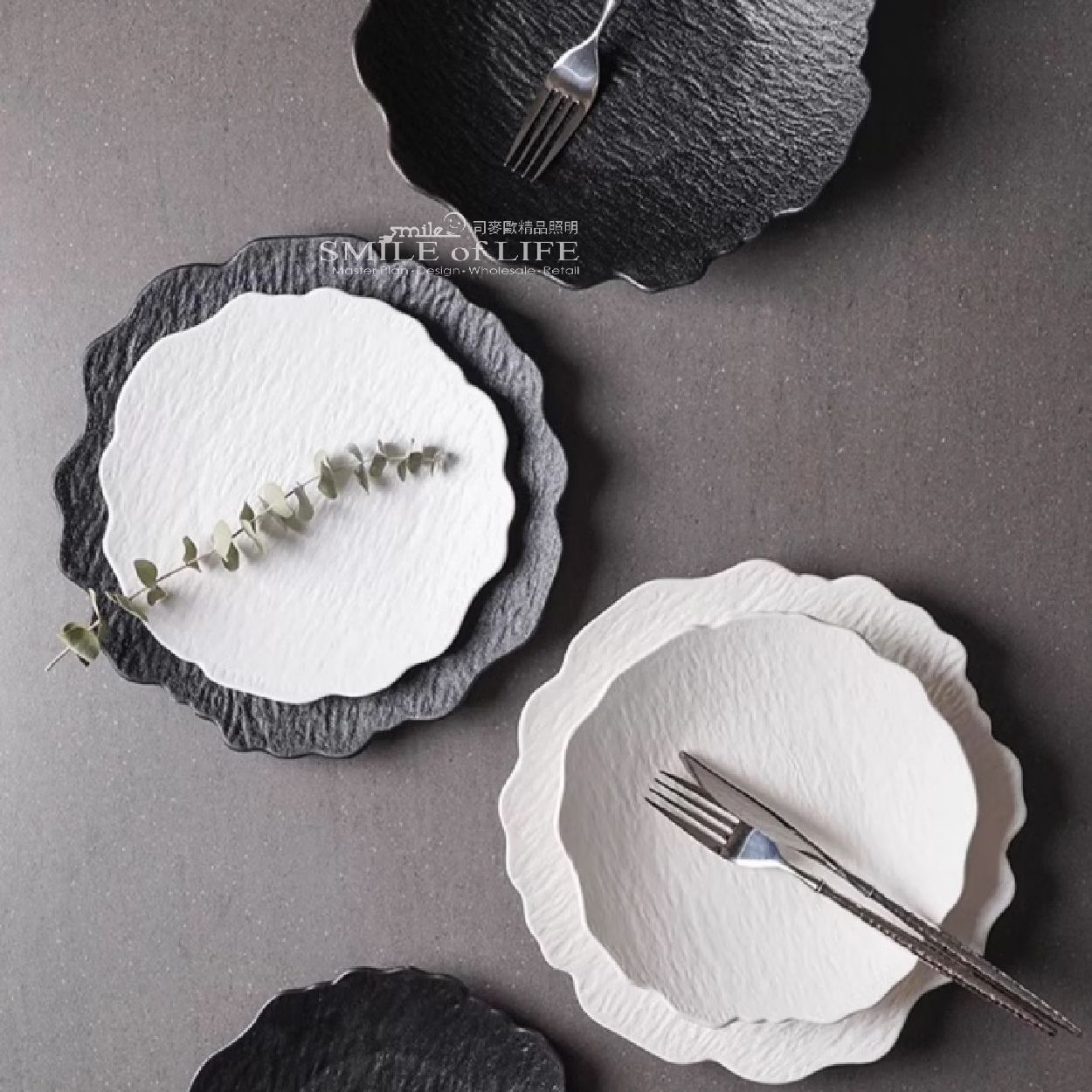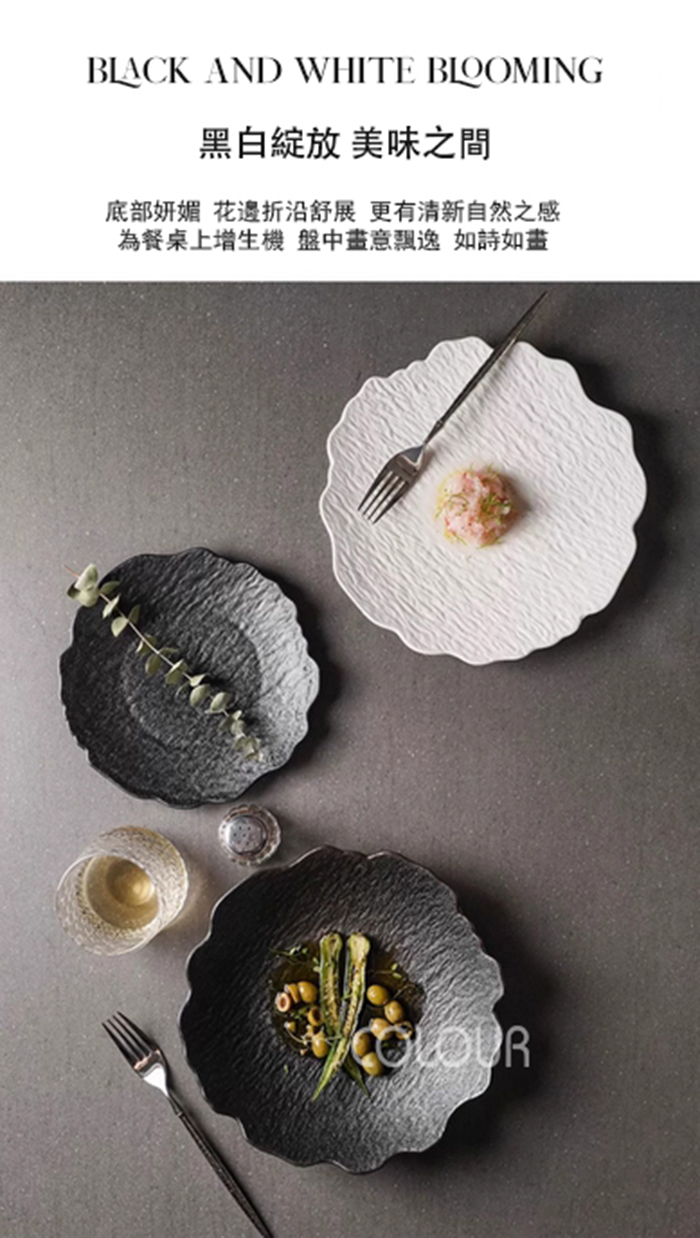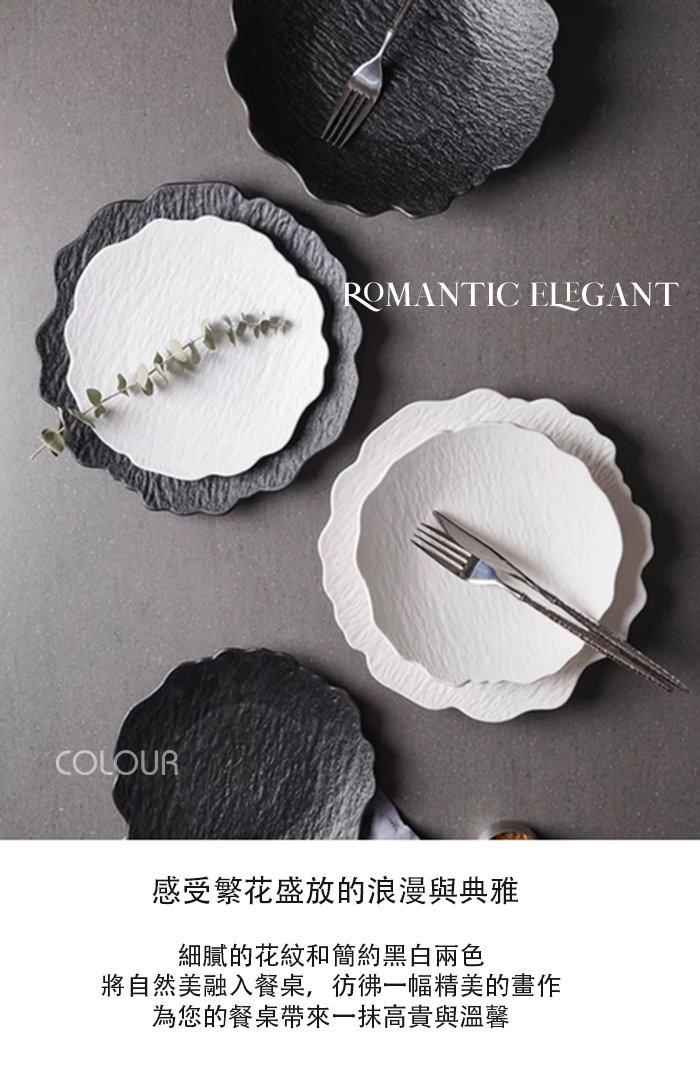 花戎系列餐盤-黑白兩色 感受繁花盛放的浪漫與典雅。 - 細膩的花紋和簡約黑白兩色 將自然美融入餐桌,彷彿一幅精美的畫作 為您的餐桌帶來一抹高貴與溫馨 商品尺寸 淺盤:直徑20.3cm 高2cm 深盤:直徑20cm 高4cm