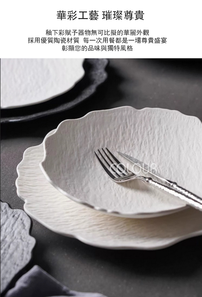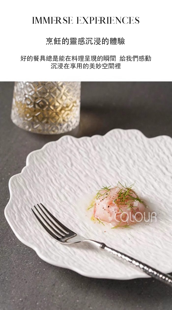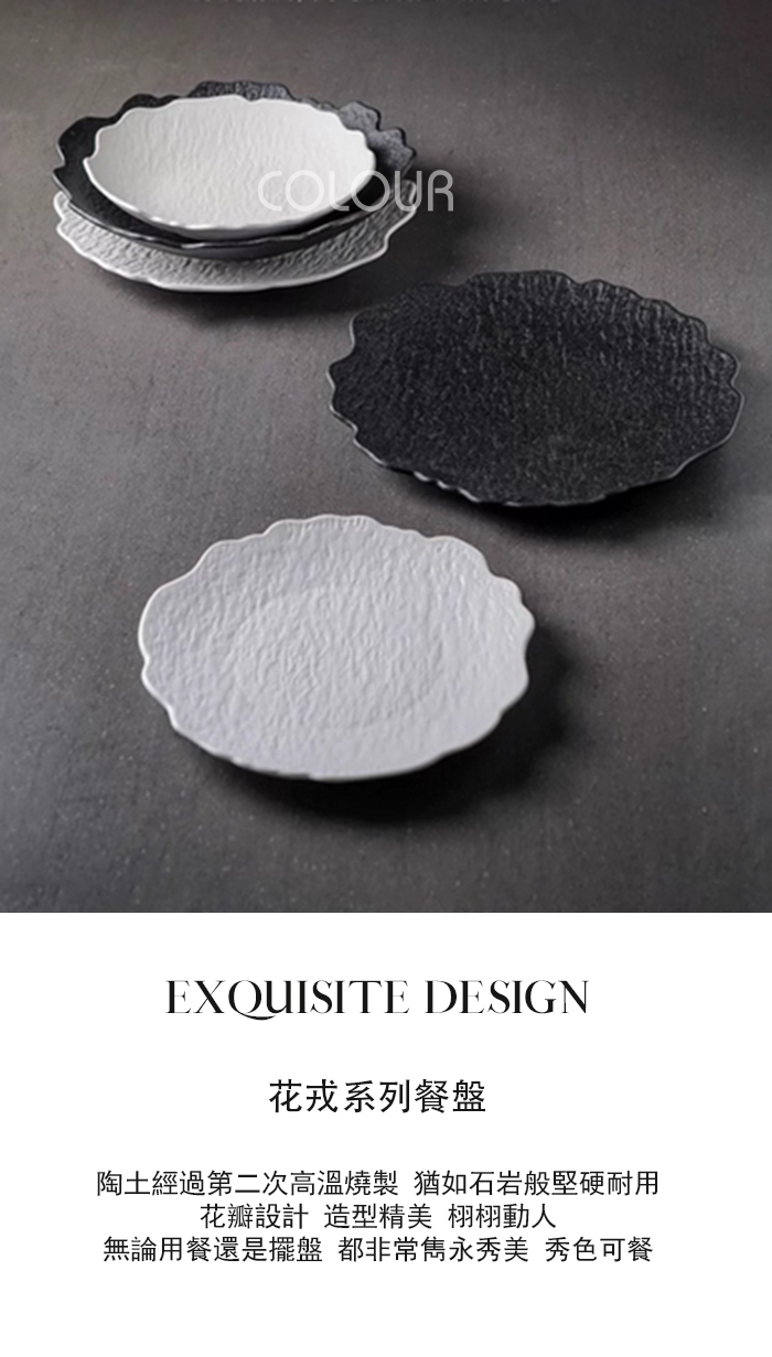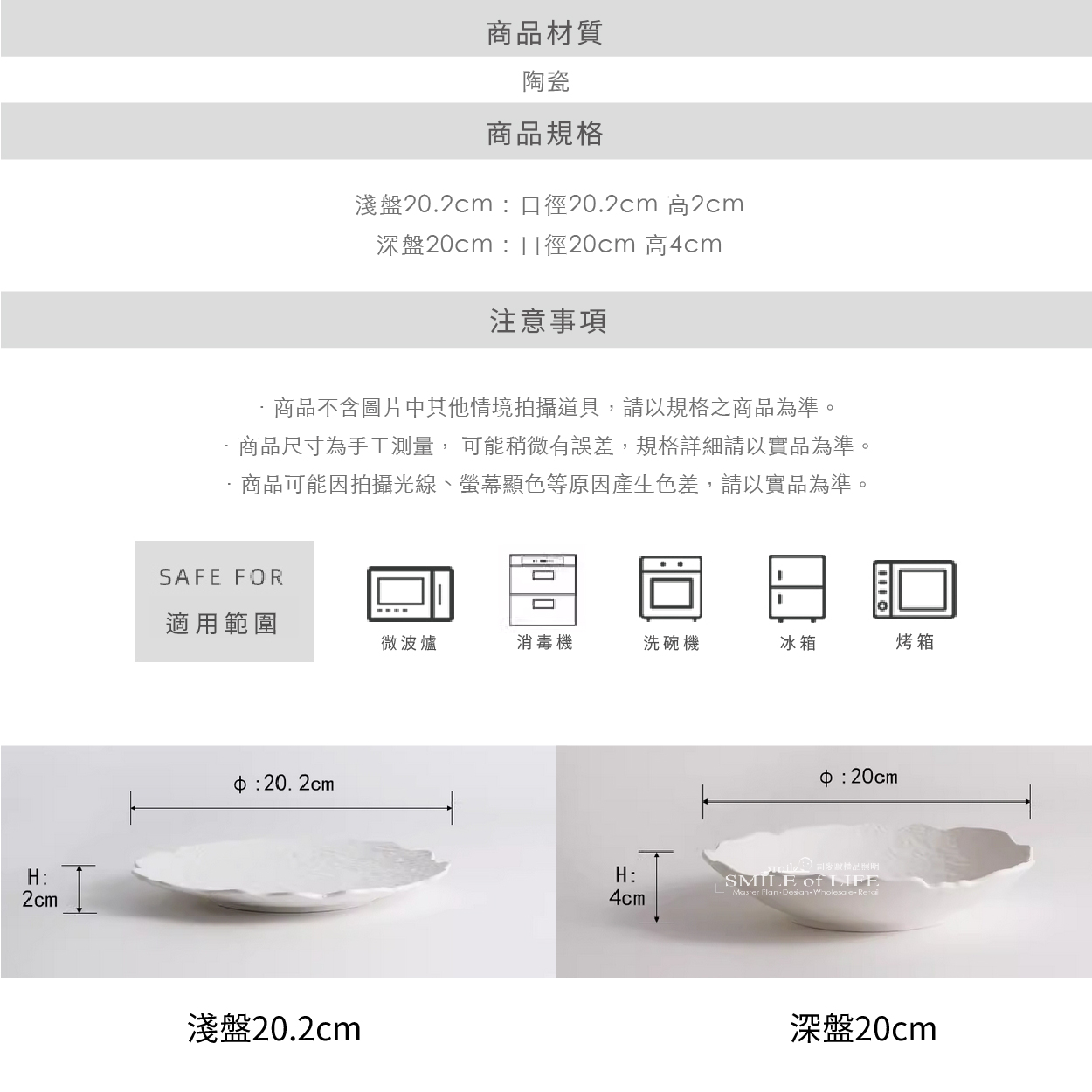 花戎系列餐盤-黑白兩色 感受繁花盛放的浪漫與典雅。 - 細膩的花紋和簡約黑白兩色 將自然美融入餐桌,彷彿一幅精美的畫作 為您的餐桌帶來一抹高貴與溫馨 商品尺寸 淺盤:直徑20.3cm 高2cm 深盤:直徑20cm 高4cm