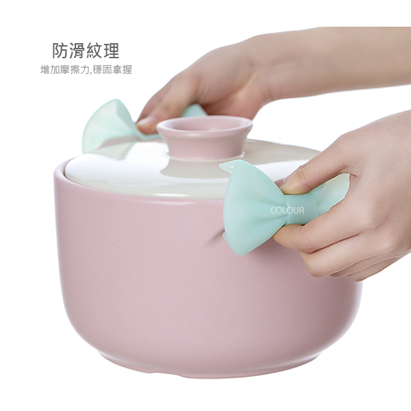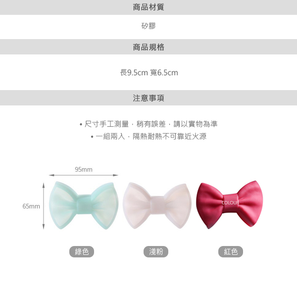 蝴蝶結造型隔熱防燙夾2入【粉/綠/紅色】 【淺粉色實品接近白色】 可愛蝴蝶結造型, 妝點你的餐桌和廚房。 耐溫防燙呵護雙手 端鍋不再怕燙手 內部防滑紋路增加摩擦力 夾取端拿更穩固 可吊掛收納省空間 值得您入手的廚房創意小物 商品尺寸:長9.5cm 寬6.5cm