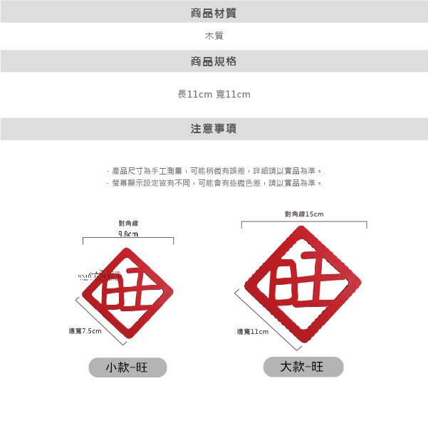 創意木質冰箱貼 這組冰箱貼寓意美好 讓生活熱鬧起來吧!! 背部內崁式磁鐵可牢固吸附 匠心工藝打磨質感非常好 可用來裝飾生活或是送人 簡單卻又心意滿滿 商品尺寸 小款:邊寬7.5*7.5cm(對角線長9.8cm) 大款:邊寬11cm *11cm(對角線長15cm) 囍:邊寬7.7cm *7.8cm 冰糖葫蘆-66大順:寬1.8cm 總長15.5cm 冰糖葫蘆-4季發財:寬1.8cm 總長12cm