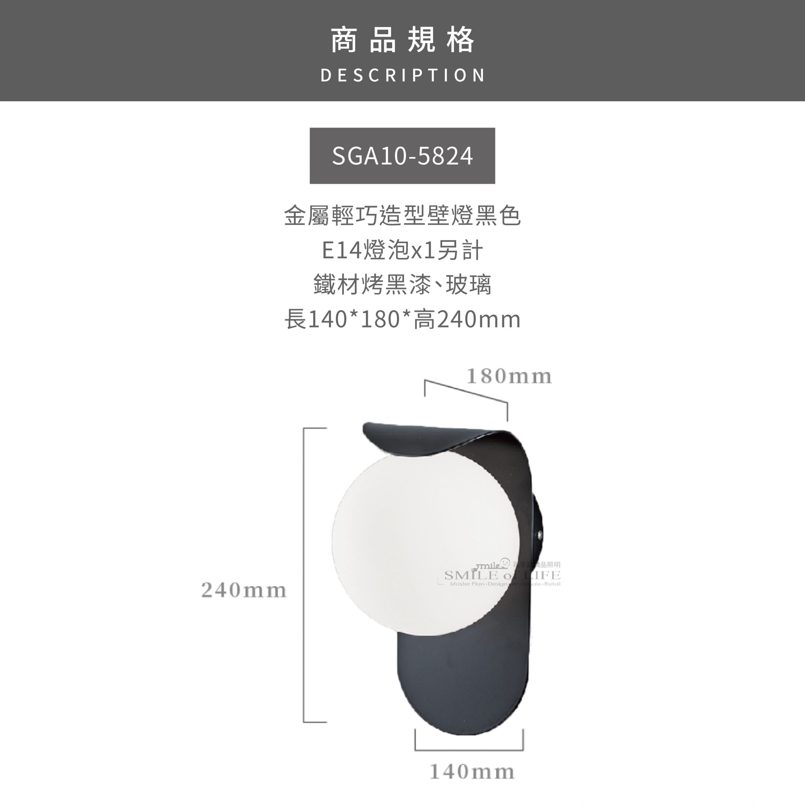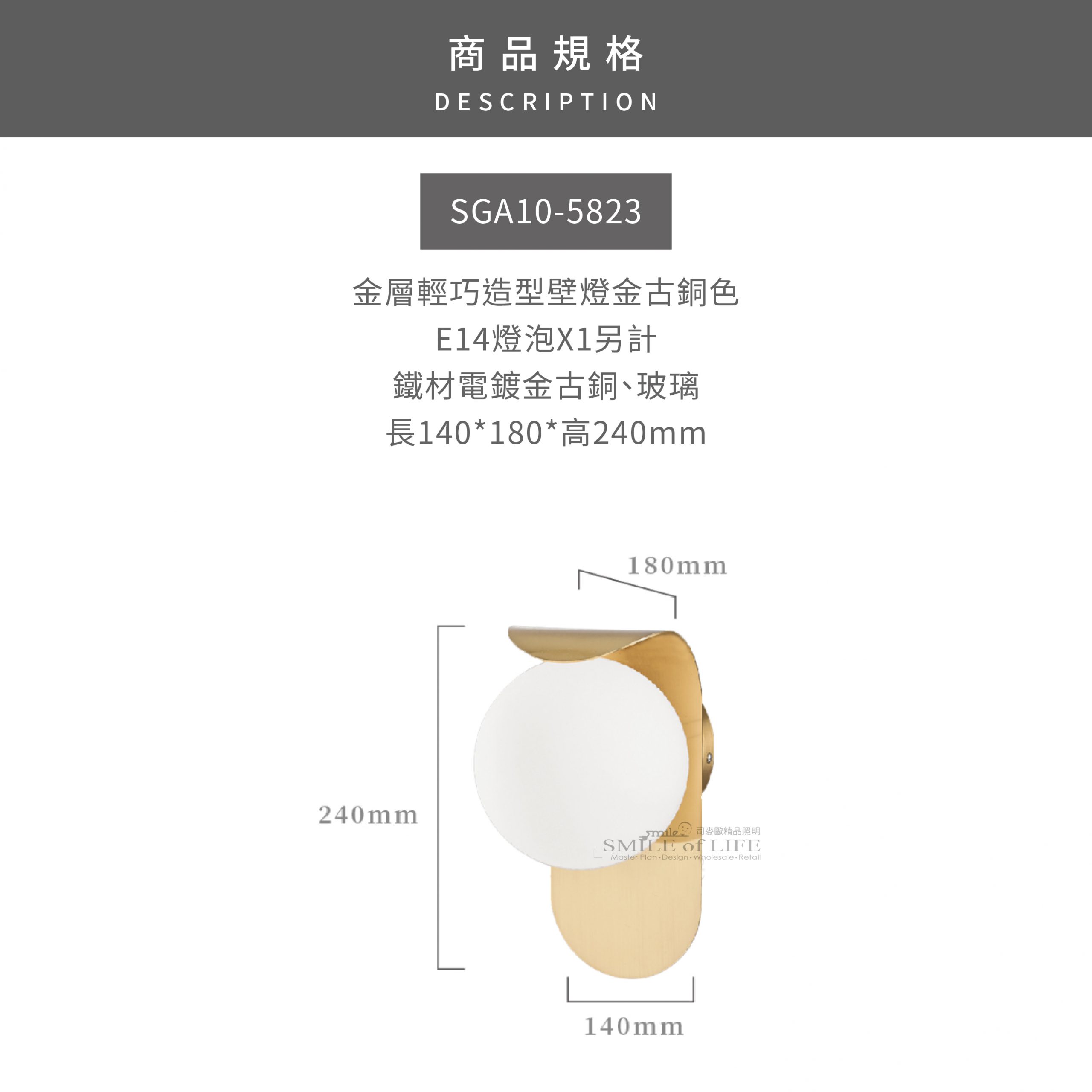 金屬輕巧造型E14壁燈 簡約不失時尚,金屬輕巧造型壁燈 黑色與金古銅色兩款時尚色調,打破傳統束縛 小巧精緻,流線設計散發獨特魅力, 點亮生活點滴,打造屬於您的光影風情。 商品規格: 【金古銅色】 型號: SGA10-5823 適用光源:E14燈泡x1另計 材質:鐵材電鍍金古銅、玻璃 尺寸:長140*180*高240mm - 【黑色】 型號: SGA10-5824 適用光源:E14燈泡x1另計 材質:鐵材烤黑漆、玻璃 尺寸:長140*180*高240mm 📣 此為金色年代燈飾,原廠保固2年 並以投保1000萬的產品責任險,請安心購買 - 💡 台灣實體店家,舞光授權經銷商,原廠保固兩年 💡 商品均有開立發票,附收據可打統編,安心購物有保障