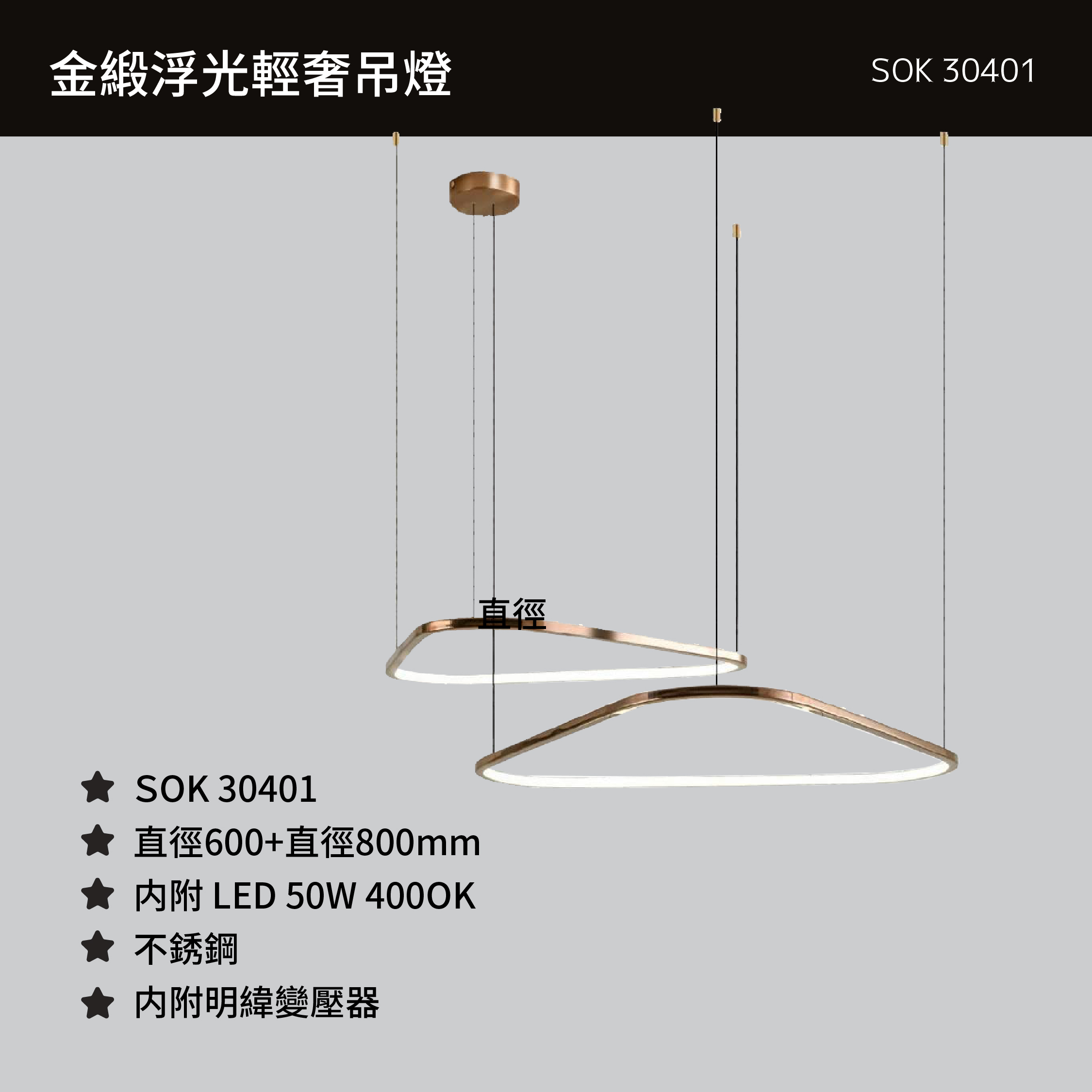 金緞浮光輕奢吊燈SOK-30401 細膩金緞質感,交織出柔和光影, 讓每一道光都流露出優雅與品味。 - 低調奢華的設計,點亮空間的格調, 無論是餐桌、客廳,或是臥室, 都能營造出溫潤而迷人的氛圍。 🌟 優雅金屬工藝,細節精緻 💡 柔和燈光,營造高級感 🏡 適用多種風格,奢雅不張揚 為你的空間添上一抹浮光流金,點亮專屬於你的輕奢時刻 商品規格: 直徑:600mm*800mm 內附LED 50W 400K 材質:不鏽鋼 內附明偉變壓器![]()