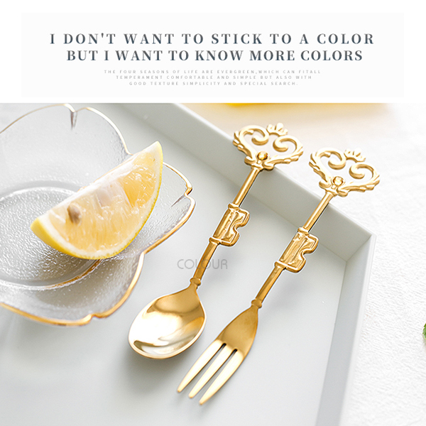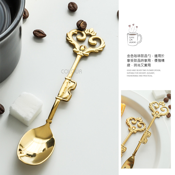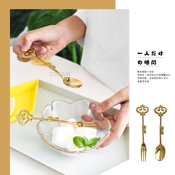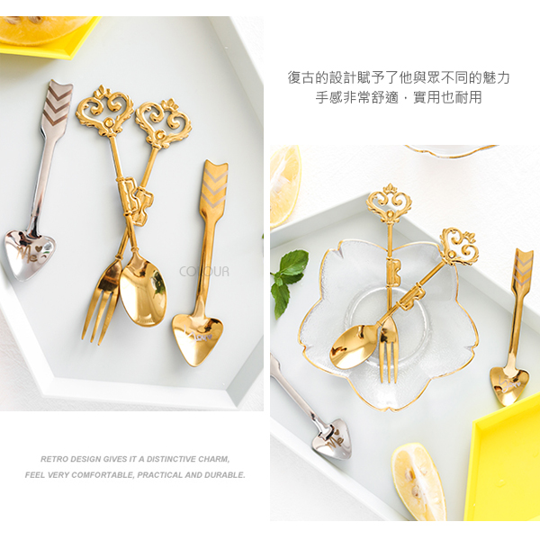 金色愛心皇冠叉勺 精緻優雅的一款餐具 復古設計賦予了它與眾不同的魅力 厚重踏實,頗有格調。 顏值指數五顆星★★★★★ 電鍍金銀精緻有光澤 適合用來吃甜品、喝咖啡 有了他下午茶更美唷☺ 或是用來當拍照道具都相當有格調 對於享受生活注重生活的你 千萬不能錯過這類迷人的小細節 【商品尺寸】 皇冠勺-長14cm 寬2.5cm 皇冠叉-長14.5cm 寬1.3cm