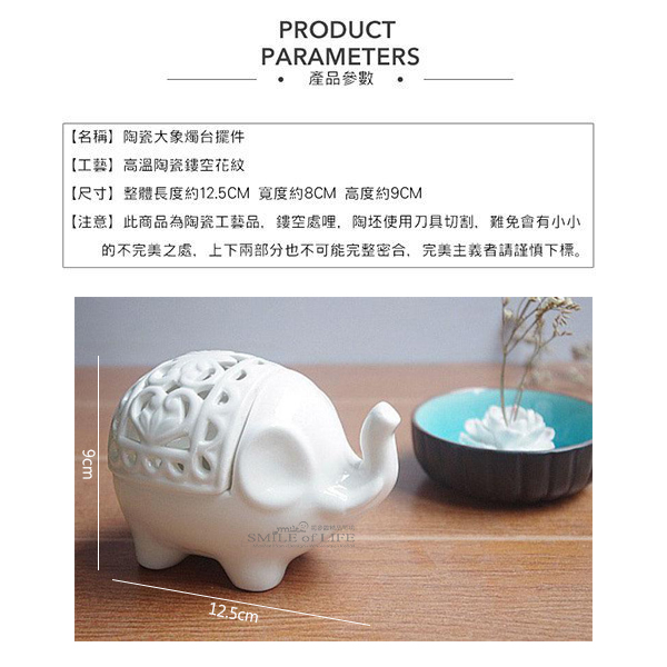 鏤空陶瓷大象造型燭台 可愛現代的陶瓷大象造型燭台 裝點居家空間質感升級 富現代感襯出時尚品味 【商品尺寸】長12.5cm 寬8cm 高9cm