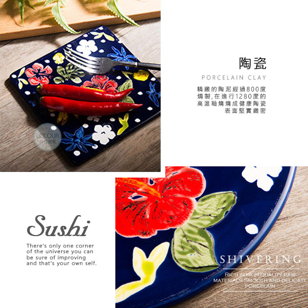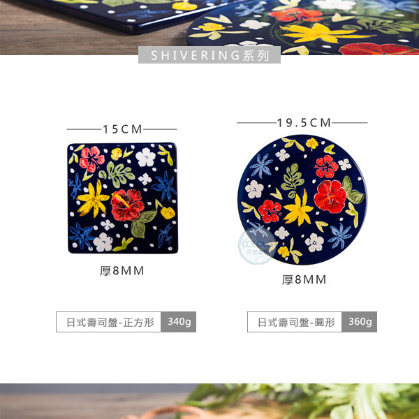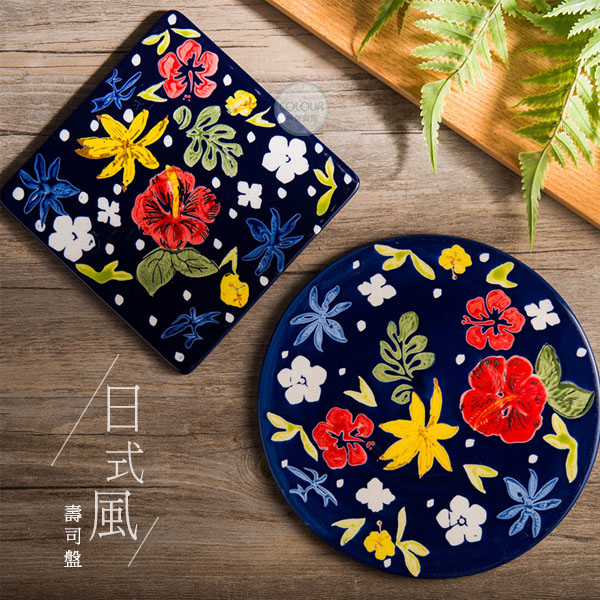 精工手繪壽司盤【正方形】 精工手繪製,亮潤釉面 放在餐桌好優美 邊用餐視覺都是一種享受 強化瓷材質高溫燒製 可做壽司盤、甜點盤等。 精緻的陶泥經過800度燒製 在進行1280度的高溫釉燒燒成健康陶瓷 表面堅實緻密 【商品尺寸】 正方形-約15cm