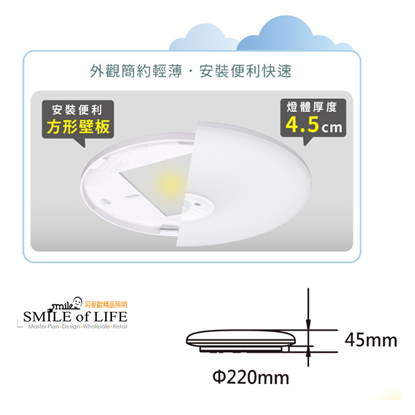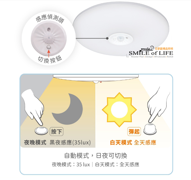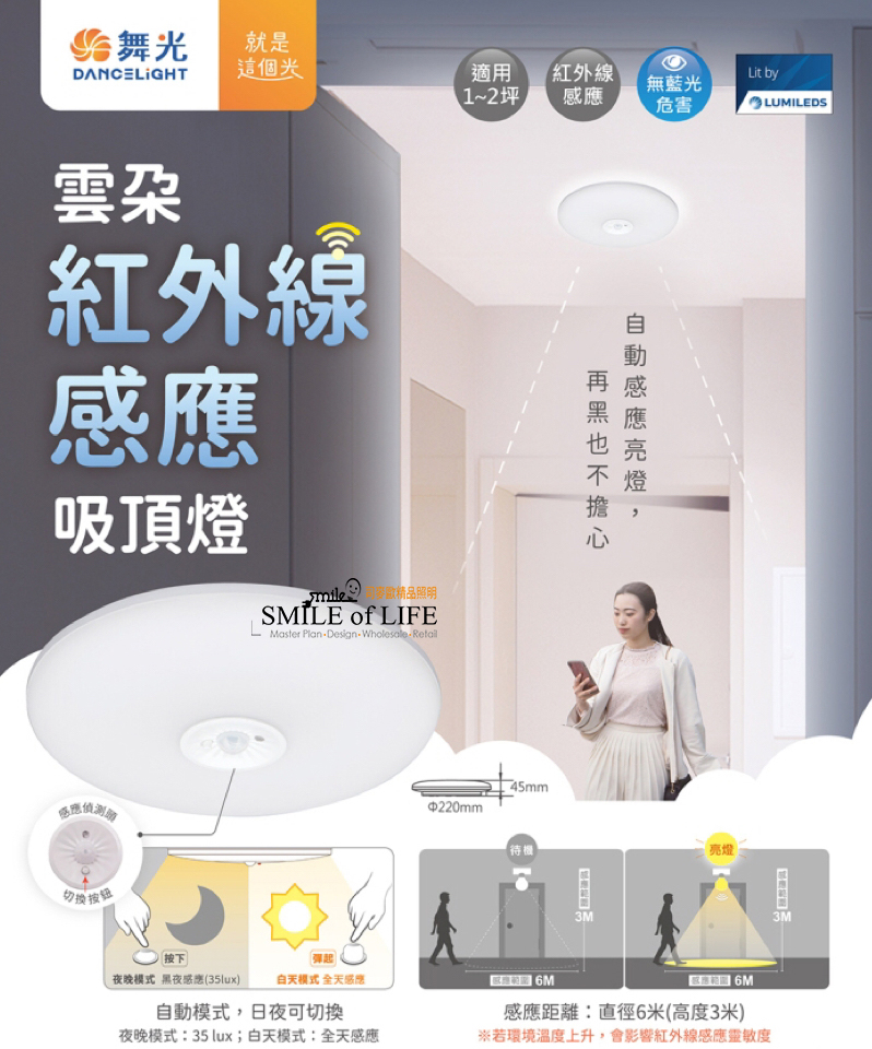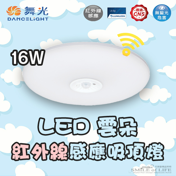 雲朵紅外線感應吸頂燈16W 透過感應熱源移動觸發亮燈 不需再摸黑尋找開關 踏入感應範圍即刻點亮! 日夜模式可隨需求切換 按下之後於低光源環境才亮燈 一鍵輕鬆節能省電~ ●感應距離:最長直徑6米 ●亮燈時間:1分鐘 商品規格: 型號: 白光LED-CEN16DIS 黃光LED-CEN16WIS 輸入電壓:100V - 240V全電壓 光 通 量:白光1440lm / 黃光1280lm 演 色 性:≧ 80 發光角度:180° 燈體材質:PP塑料 平均壽命:15000hr 適用坪數:1-2坪 產品尺寸:Ø 220mm²;H 45mm 💡 高雄實體店家,舞光授權經銷商,享原廠保固 💡 商品均有開立發票,附收據可打統編,安心購物有保障 💡 宅配部分偏遠地區或外島需要額外酌收聯運費!!