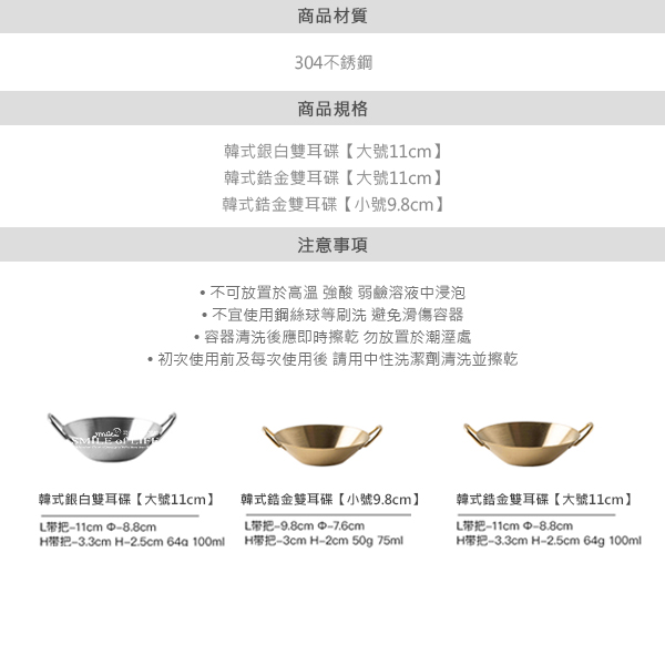 韓式雙耳不銹鋼醬碟 304不鏽鋼材質,使用起來健康又安心, 啞光拉絲工藝打磨,平滑易清洗,可疊加收納, 吃小菜、沾料,料裡備用食材等,多功能使用, 銀白、鋯金雙色自由選擇。 不可放置於高溫、強酸、弱鹼溶液中浸泡。 不宜使用鋼絲球等刷洗,避免滑傷容器。 初次使用前及每次使用後,請用中性洗潔劑清洗並擦乾。 商品規格: 韓式銀白雙耳碟【大號11cm】 韓式鋯金雙耳碟【大號11cm】 韓式鋯金雙耳碟【小號9.8cm】