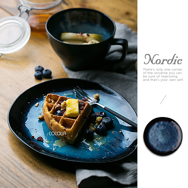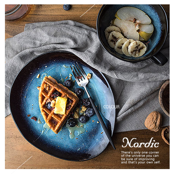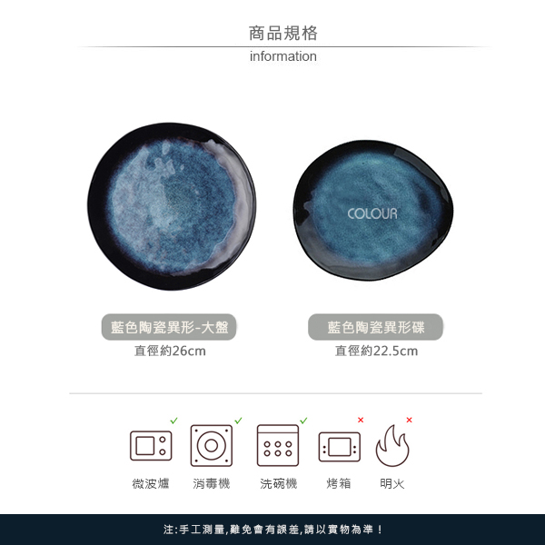 歐式神秘藍不規則陶瓷盤 文藝復古款式 低調的神祕藍 邊緣暗色系漸層 色彩的變化柔和自然 簡單又大氣 手工製作盤邊緣不規則形狀 也是商品的亮點之一 獨特不失顏值! 【商品尺寸】 小盤:直徑22.5cm 大盤:直徑26cm