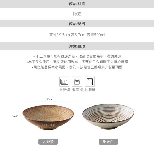 龍潭日式復古麵碗【兩色】 粗曠與內斂,融合百味 古樸的質感與高溫陶泥結合, 靜與動中取得了很好的平衡, 陶土原有的韻味充滿生活的氣息, 讓人越用越愛,自然呈現為器皿增添風情, 讓人不禁想拿起進而經常使用。 冷天為自己煮上一碗熱呼呼的麵, 暖心又暖胃! 大容量的陶瓷碗,溫潤立體的紋理, 搭配的剛剛好~ 商品規格: 直徑19.5cm 高5.7cm 容量500ml