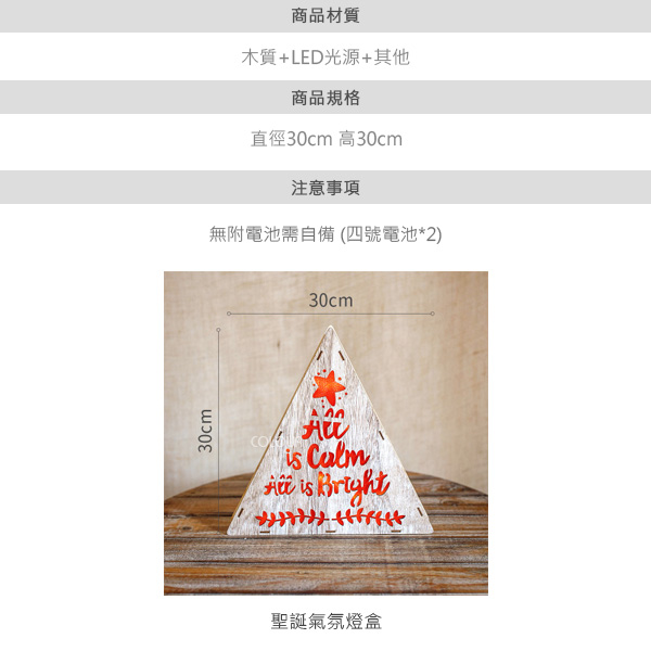 美式 聖誕氣氛裝飾燈箱C款 今年新推出燈箱 很適合拿來當作小夜燈 或是交換禮物 送禮自用兩相宜 就讓溫暖的燈光陪你/妳一起過耶誕! 商品尺寸 直徑30cm 高30cm (四號電池*2)