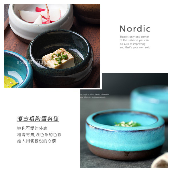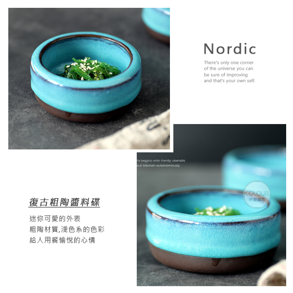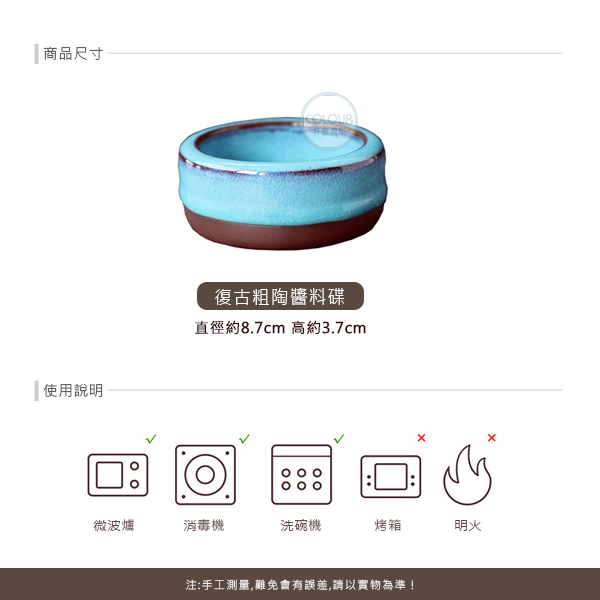 烏托邦復古粗陶醬料碟【4款】 小碟質感很好! 顏色復古美添增許多質感 銅綠醬料碟迷你可愛的外表 無論是裝小菜或是擺拍都是不錯的選擇 粗陶材質,淺色系的色彩 給人用餐愉悅的心情! 【商品尺寸】 直徑約8.7cm 高3.7cm