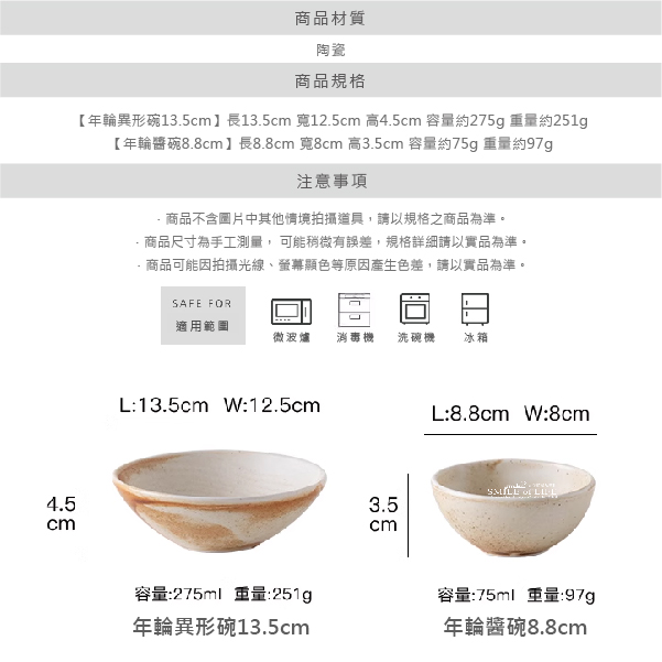 DX-年輪系列陶瓷碗 追溯時光的魅力,自然年輪的獨特美感 象徵著成長與永恆的優雅 為您的餐桌增添一抹精緻復古氛圍 讓每一餐都成為非凡的體驗 商品尺寸: 醬料碗:口徑8.8cm 高3.5cm 異形碗:口徑13.5cm 高4.5cm