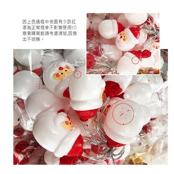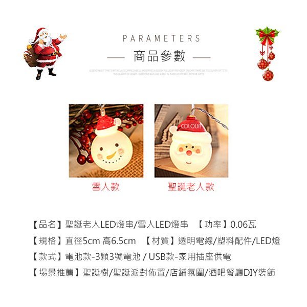 LED聖誕老人/雪人款燈串【USB款/電池款】 聖誕節來臨時 家家戶戶都會用紅色系來裝飾 來介紹兩款超可愛燈串 聖誕老人/雪人款 濃濃的聖誕氣氛 滿滿的儀式感 和孩子們一起佈置聖誕樹 是多麼溫馨且幸福~ ▪USB款-長亮 ▪電池款-長亮+閃爍(三顆三號電池) 商品尺寸 直徑5cm 高6.5cm