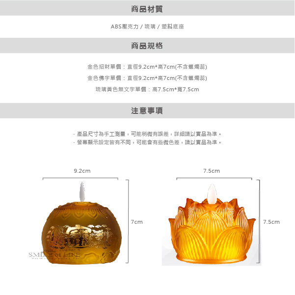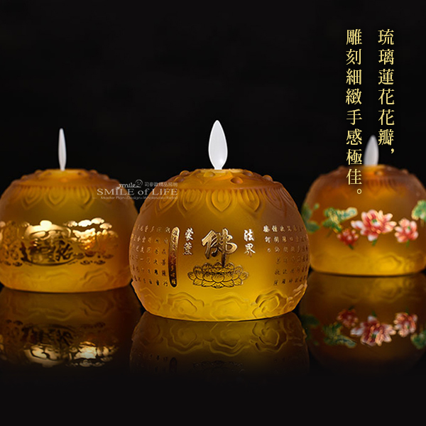 LED蓮花佛供燈【三款】 燈是智慧、光明的象徵, 點燃供佛是佛門中重要的供養之一, 佛前供燈稱得上供養之王。 祈福、禮佛,功德物亮,福德善緣。 蓮花造型佛供燈設計精美, 紋理清晰細膩, 做工細緻雅致, 造型精緻大方逼真。 商品規格: 金色招財款單個:直徑9.2cm*高7cm(不含蠟燭蕊) 金色招財款單個:直徑9.2cm*高7cm(不含蠟燭蕊) 琉璃黃色無文字單個:高7.5cm*寬7.5cm