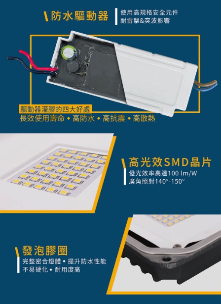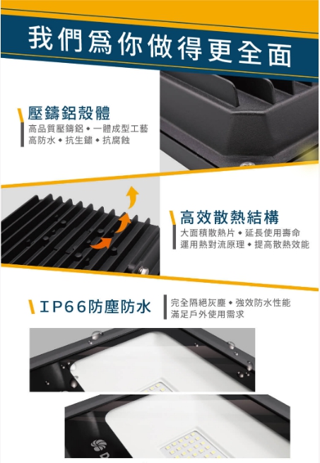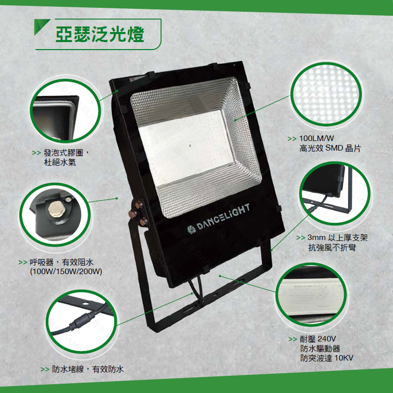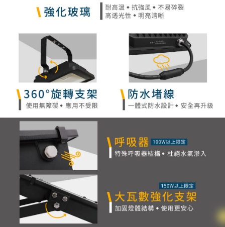 舞光LED亞瑟泛光燈 ✦ 特殊呼吸器結構 是「亞瑟泛光燈」最亮眼的特色 它可以有效杜絕水氣的滲入 大大延長燈具的使用壽命 這項特殊設計使亞瑟穩坐泛光燈之王的寶位! 最高規格的泛光燈,滿足戶外使用需求 ☑ 國家級CNS認證 ☑ IP66防塵防水等級 ☑ 500小時鹽霧測試(CNS8886) ✦ 防突波達10kV ✦ 可安裝於-40℃低溫環境 ✦ 厚支架抗強風不折彎 ✦ 高光效 100 lm/W 商品規格: 消耗電力:50W 產品型號:SOD-FLS50DR1 (正白) / SOD-FLS50WR1(黃光) 輸入電壓:100V-240V(全電壓) 驅動器:內含(防水驅動器) 色溫:6500K±10% 3000K±10% 光通量:5000LM / 4500LM 演色性:≧ 80 平均壽命:15000 小時 發光角度:140° 燈體材質:壓鑄鋁、強化玻璃 尺寸:W245mm H330mm D50mm 防護等級:IP66 - 消耗電力:100W 產品型號:SOD-FLS100DR1 (正白) / SOD-FLS100WR1(黃光) 輸入電壓:100V-240V(全電壓) 驅動器:內含(防水驅動器) 色溫:6500K±10% 3000K±10% 光通量:10000LM / 9000LM 演色性:≧ 80 平均壽命:15000 小時 發光角度:140° 燈體材質:壓鑄鋁、強化玻璃 尺寸:W300mm H430mm D60mm 防護等級:IP66 - 消耗電力:150W 產品型號:SOD-FLS150DR1 (正白) / SOD-FLS150WR1(黃光) 輸入電壓:100V-240V(全電壓) 驅動器:內含(防水驅動器) 色溫:6500K±10% 3000K±10% 光通量:15000LM / 13500LM 演色性:≧ 80 平均壽命:15000 小時 發光角度:140° 燈體材質:壓鑄鋁、強化玻璃 尺寸:W325mm H440mm D75mm 防護等級:IP66 - 消耗電力:200W 產品型號:SOD-FLS200DR2 (正白) 輸入電壓:100V-240V(全電壓) 驅動器:內含(防水驅動器) 色溫:6500K±10% 光通量:20000LM 演色性:≧ 80 平均壽命:15000 小時 發光角度:140° 燈體材質:壓鑄鋁、強化玻璃、深灰色粉體防鏽烤漆 尺寸:W545mm H380mm D80mm 防護等級:IP66
