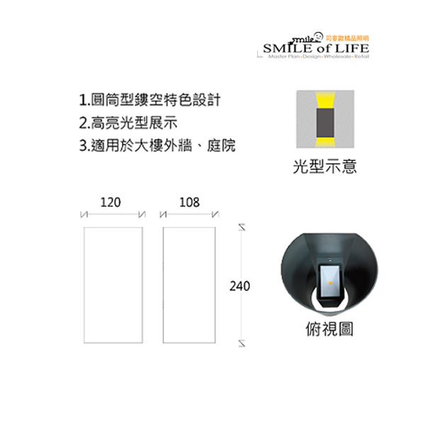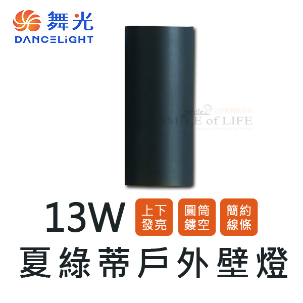 舞光夏綠蒂壁燈13W SOD2299 1. 圓筒型鏤空特色設計 2. 上下洗光,輕鬆描繪牆面、牆柱、建築線條光影 3. 簡約線條設計,百搭各式牆面,高雅時尚 商品尺寸: 型號:SOD2299 消耗電力:13W 色溫:3000K 光通量:725LM 演色性:80RA 發光角度/光束角:73° 燈體材質:壓鑄鋁、鋼化玻璃 【賣場相關】 💡 台灣實體店家,舞光授權經銷商,原廠保固兩年 💡 商品均有開立發票,附收據可打統編,安心購物有保障 💡 宅配部分偏遠地區或外島需要額外酌收聯運費!!