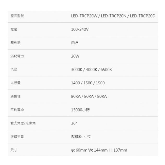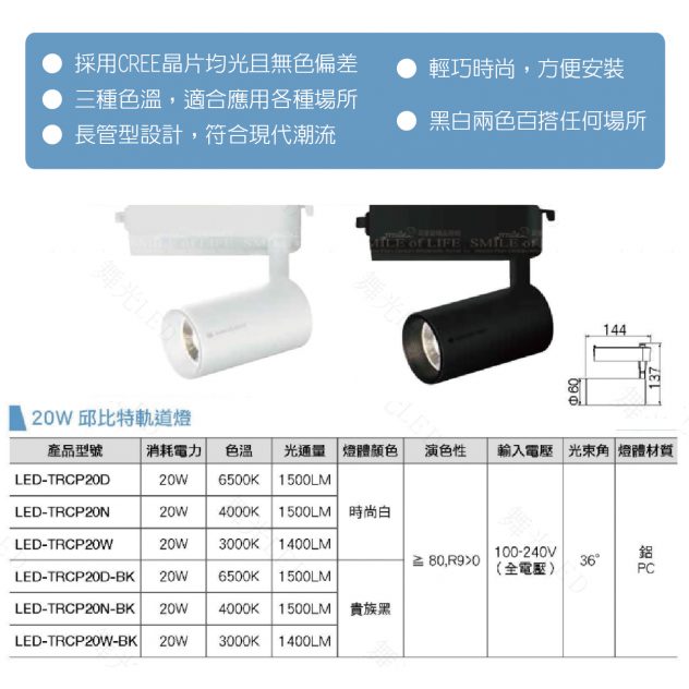 白殼3000K, 白殼4000K, 白殼6500K, 黑殼3000K, 黑殼4000K, 黑殼6500K