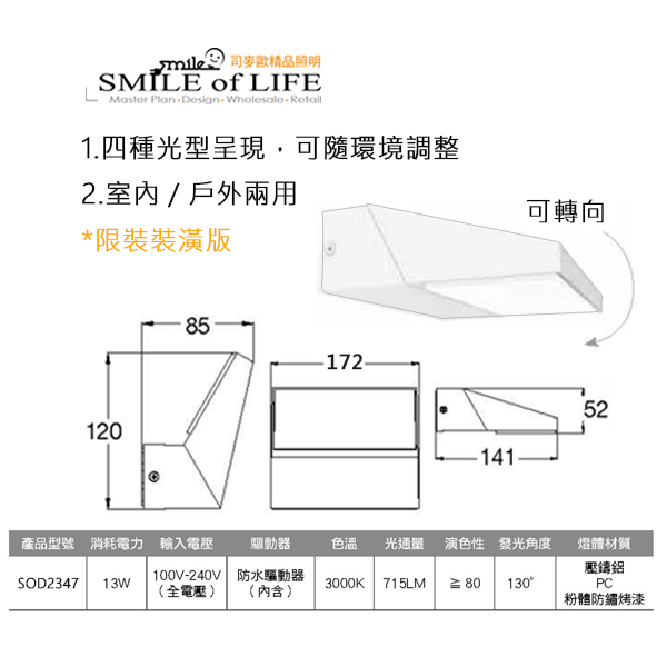 舞光13W方轉壁燈SOD2347 1. 四種光型呈現,可隨環境調整 2. 室內/戶外兩用 3. 限裝裝潢板 商品尺寸: 型號:SOD-2347 消耗電力:13W 色溫:3000K 光通量:715LM 演色性:80RA 發光角度:130° 燈體材質:壓鑄鋁、PC 尺寸:長172*寬141*高52mm 【賣場相關】 💡 台灣實體店家,舞光授權經銷商,原廠保固兩年 💡 商品均有開立發票,附收據可打統編,安心購物有保障 💡 宅配部分偏遠地區或外島需要額外酌收聯運費!!