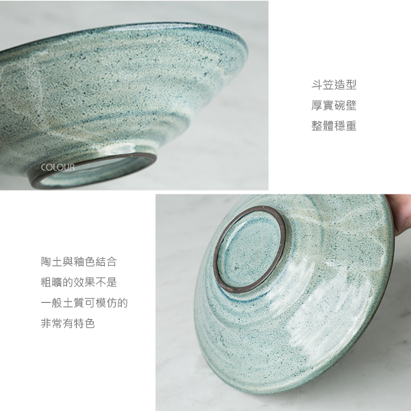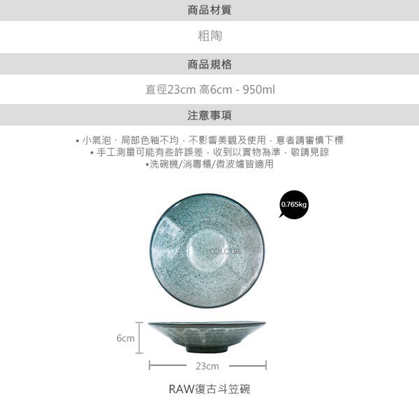RAW復古斗笠碗 ✅斗笠造型 ✅厚實碗壁 ✅整體穩重 斗笠碗顏值高頗受歡迎 23cm大小很適合家庭 無論是日常裝菜或是湯麵等等都非常適合 艷而不俗,美炸!喜歡的別錯過! 陶土與釉色結合 粗曠的效果不是一般土質可模仿的 非常有特色 商品尺寸 直徑約23cm 高6cm 950ml