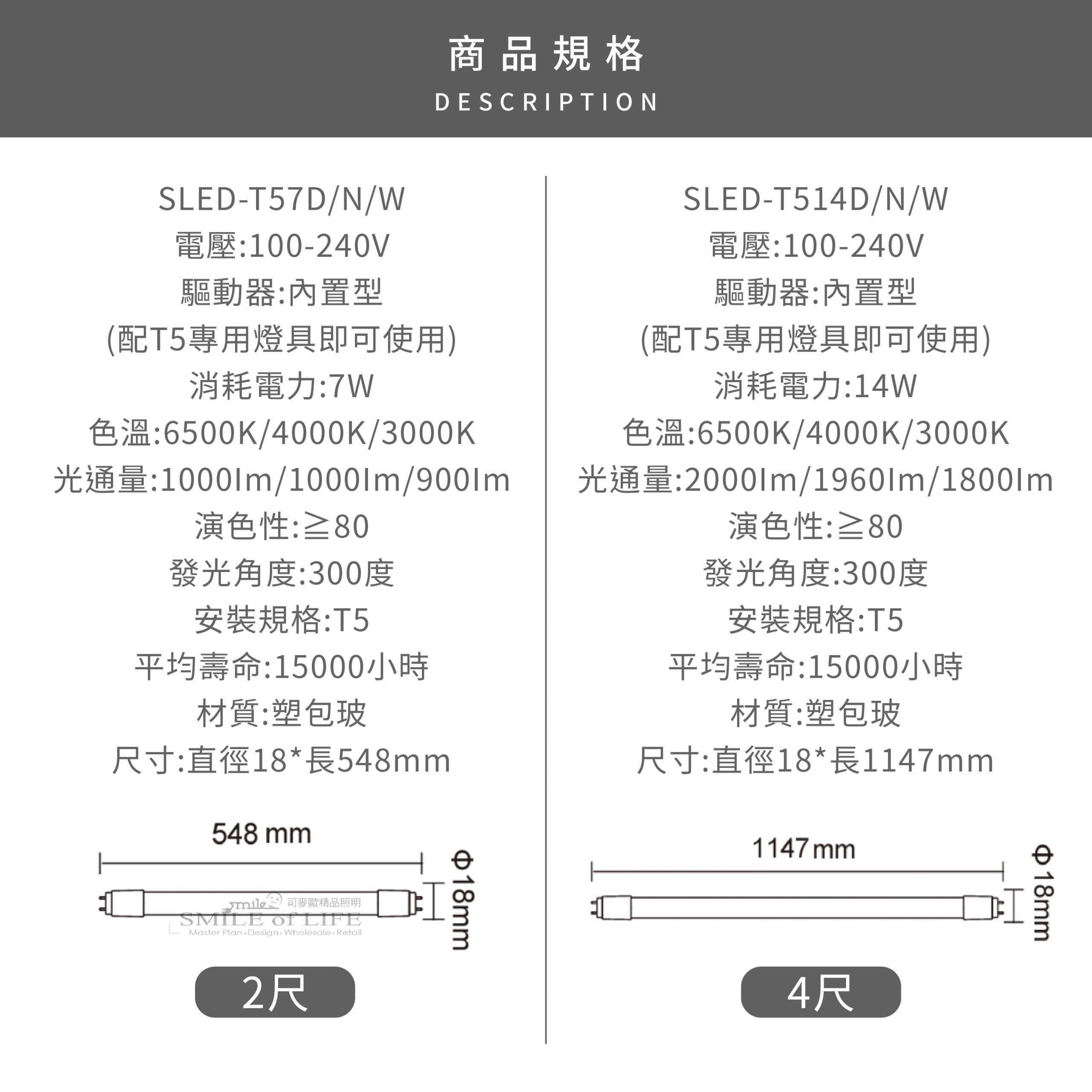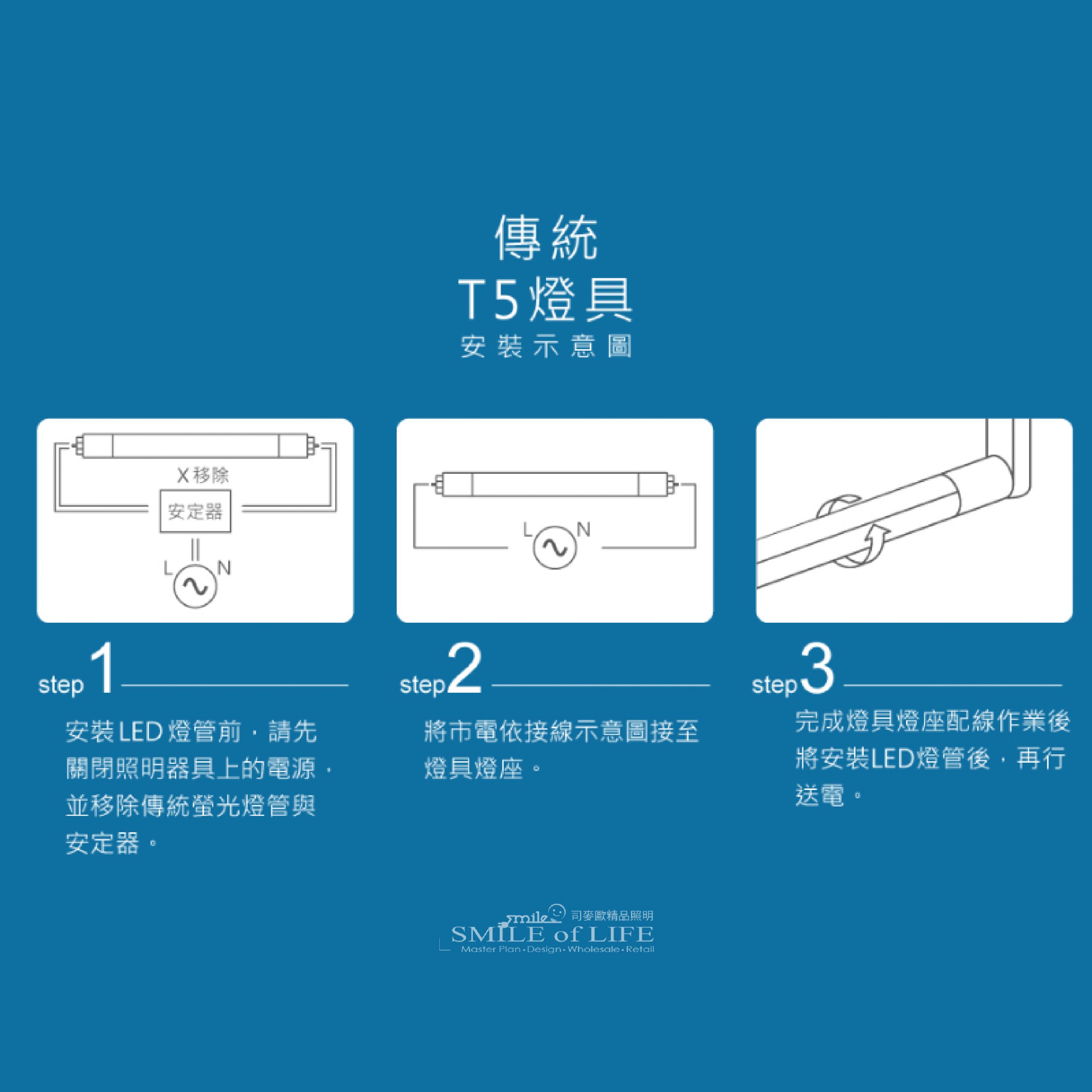 5. 不需要安定器,故需搭配無安定器的LED T5支架燈具