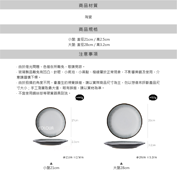 VP創意北歐西餐盤【小盤】 米白色釉面 呈現柔美的觀感 米白色調,帶來柔和的桌面美感 在燈光下用餐 更彰顯氣氛的融洽與溫馨 釉面光潔 觸感柔和光滑 無論是正面的素白釉面 還是背面的馥郁綠釉 觸感都十分光滑 且如鏡面般反射光澤 漸變窯變釉 聚焦於食器之中 邊沿流淌般如水墨色的紋路 彷彿正向著中心慢慢渲染 充滿了美感 商品尺寸: 大盤:直徑28cm / 高3.2cm 小盤:直徑21cm / 高2.5cm